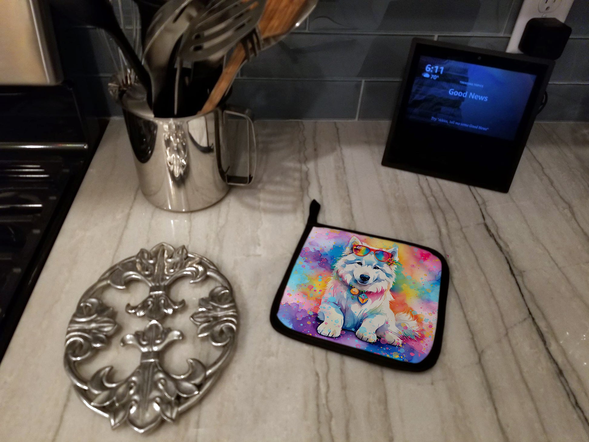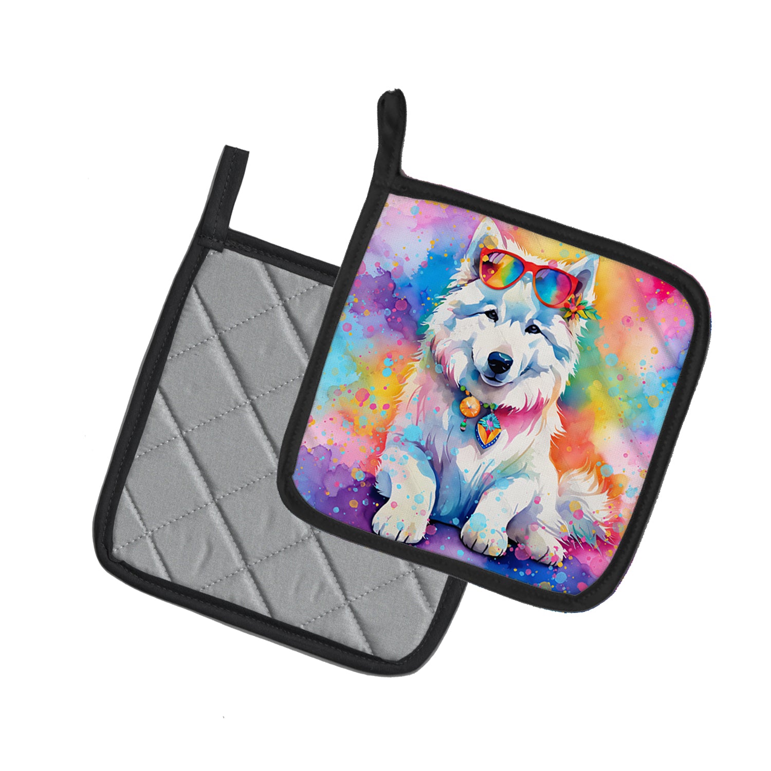 Pair of Pot Holders featuring breed specific Samoyed artwork. A Pair of Pot Holders to match your kitchen decor. Made in the USA these are thick and functional. Full color artwork decorates the front polyester fabric of the hot pad and accented by a black trim. Use these at as a trivet for your Thanksgiving or Christmas tablescape. Filled with insulated fabric and quilted for durability. These colorful pot holders will make a great gift for your favorite home cook or executive chef. Each pot holder measures approximately 7 1/2 inches by 7 1/2 inches. A hanging tab is included.