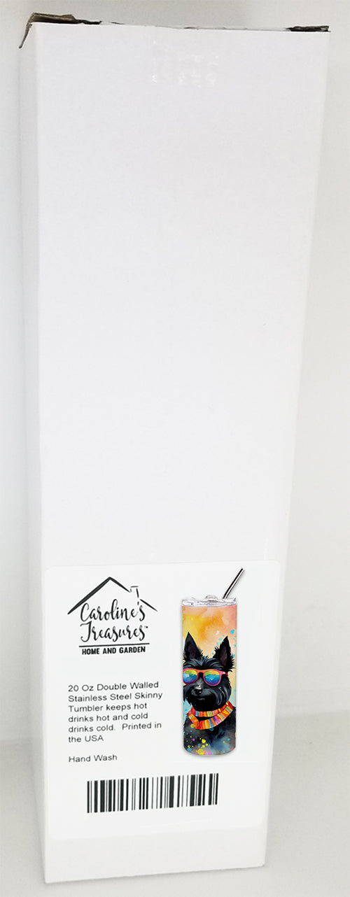 Stainless Steel Skinny Tumbler featuring breed specific Scottish Terrier artwork. Elevate your hydration experience with our Decorative Stainless Steel 20 oz Skinny Tumbler from Caroline's Treasures. This vacuum-insulated, double-walled travel mug is designed to keep your beverages hot or cold for prolonged periods, making it perfect for your coffee, tea, or cocktails. Its sleek and easy-to-grasp design, complemented by the vibrant, top-to-bottom artwork, makes it a stylish accessory for both men and women. Equipped with a secure, slide-open lid, you can enjoy your drinks without worrying about spills, while the included reusable metal straw contributes to reducing plastic use and promoting sustainability. Crafted with quality stainless steel, the tumbler is 100% BPA and Phthalate free, ensuring a safe, non-toxic experience with every sip. Not just functional, this skinny tumbler, complete with gift box, serves as a thoughtful gift for women, mothers, or any loved one. Enjoy your favorite beverages on the go in style, while making a positive impact on the environment. Remember, it's not just a drinkware, it's a lifestyle accessory! Please note: For optimum longevity, hand washing is recommended.