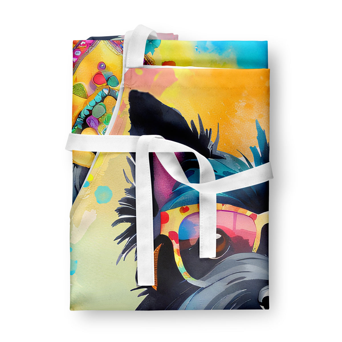Apron featuring breed specific Scottish Terrier artwork. Elevate your cooking, baking, and grilling experiences with our versatile Kitchen or BBQ Apron. This Bib Style apron isn't just limited to culinary activities - it also serves as an excellent baking apron, artist apron, server apron, gardening apron, or even a dog grooming apron. The apron showcases vibrant full-color artwork contributed by one of our talented artists, bringing a dash of style to your daily tasks. With dimensions of approximately 27"W x 30"H, it provides ample coverage to protect your clothing from spills and splashes. Our apron is meticulously crafted from 100% Ultra Spun Polyester, known for its durability and lightweight nature. The apron comes with white tie straps, ensuring a comfortable and adjustable fit for all. It's a perfect choice for kitchen apron enthusiasts, whether you are a woman or a man. Designed for easy maintenance, this apron is fully machine washable. The quick-drying polyester material actively reduces staining, keeping your apron looking fresh and new for longer. Our beautifully designed apron isn't just a functional kitchen accessory - it's a fashion statement in the culinary world!