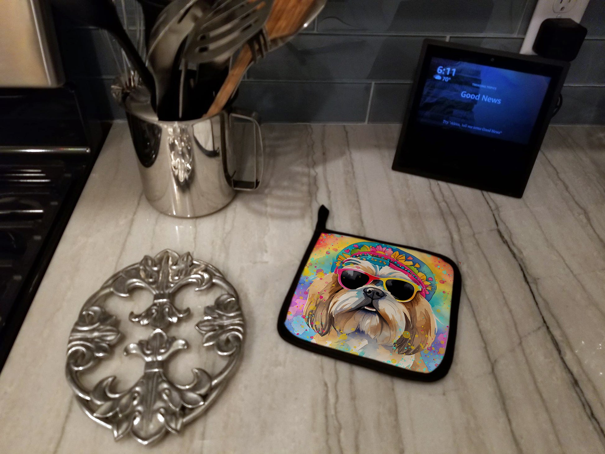 Shih Tzu Hippie Dawg Pair of Pot Holders