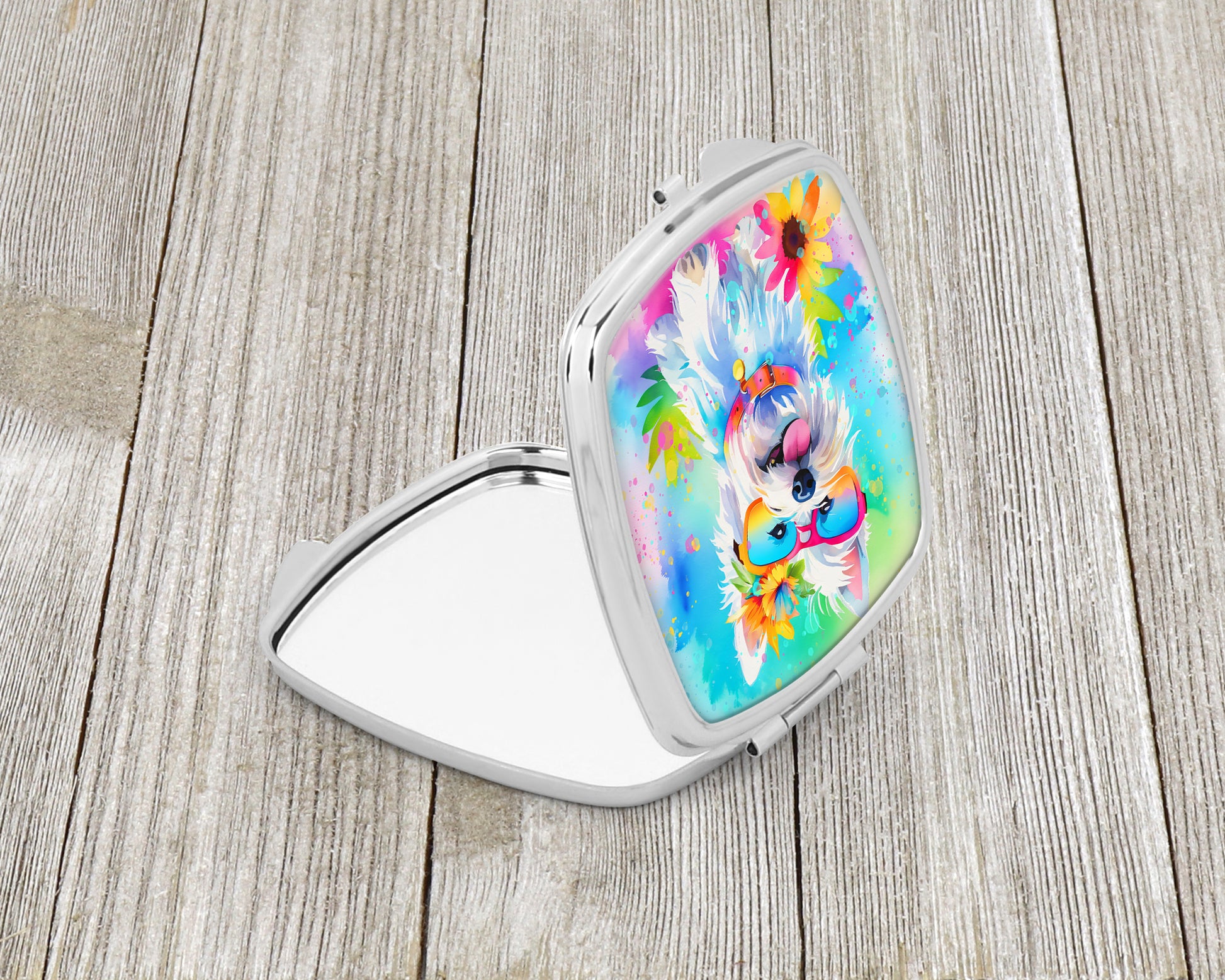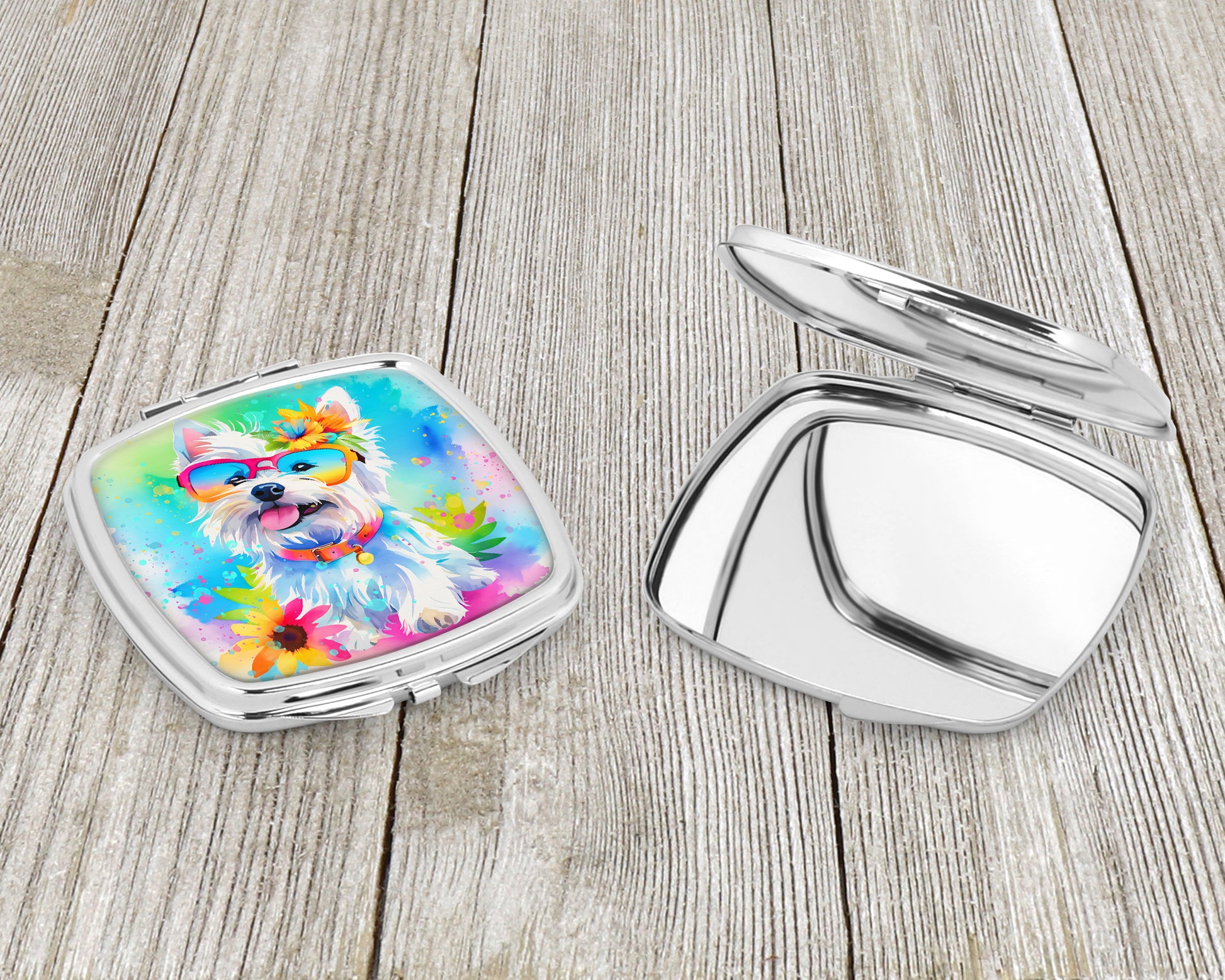 Compact Mirror featuring breed specific West Highland White Terrier artwork. Introducing our Square Compact Mirror, a blend of elegance, functionality, and compactness, perfect for on-the-go touch-ups. This Silvertone metal mirror, with dimensions of 2.75 inches x 3 inches x .3 inches, fits effortlessly into your purse, handbag, or pocket, ensuring that you can check your appearance anytime, anywhere. Our compact mirror stands out with its eye-catching artwork on the front, adding a dash of style to this practical accessory. It is more than just a mirror; it's a statement piece that reflects your personality and aesthetic. When opened, this compact reveals two mirrors inside, doubling your perspective for precise touch-ups. The Silvertone metal construction ensures durability while maintaining a lightweight feel, making it an ideal everyday carry item. Whether you're rushing to a meeting, prepping for a dinner date, or just need a quick check on your look, our Square Compact Mirror is your reliable companion. Experience the perfect blend of style and practicality with this must-have accessory.