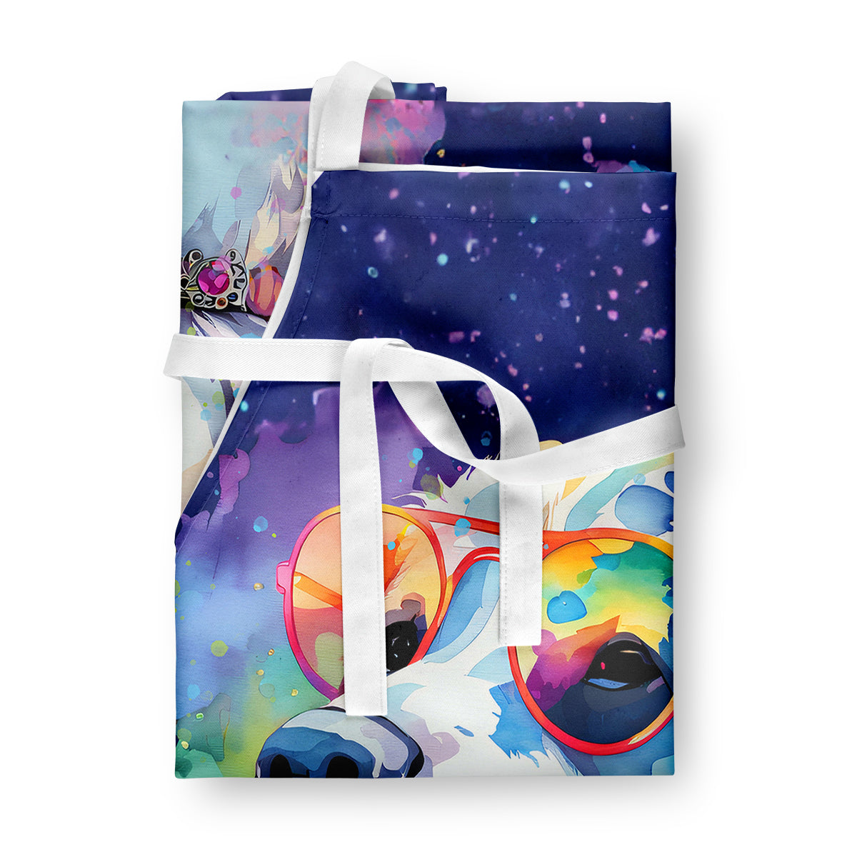 Elevate your cooking, baking, and grilling experiences with our versatile Kitchen or BBQ Apron. This Bib Style apron isn't just limited to culinary activities - it also serves as an excellent baking apron, artist apron, server apron, gardening apron, or even a dog grooming apron. The apron showcases vibrant full-color artwork contributed by one of our talented artists, bringing a dash of style to your daily tasks. With dimensions of approximately 27"W x 30"H, it provides ample coverage to protect your clothing from spills and splashes. Our apron is meticulously crafted from 100% Ultra Spun Polyester, known for its durability and lightweight nature. The apron comes with white tie straps, ensuring a comfortable and adjustable fit for all. It's a perfect choice for kitchen apron enthusiasts, whether you are a woman or a man. Designed for easy maintenance, this apron is fully machine washable. The quick-drying polyester material actively reduces staining, keeping your apron looking fresh and new for longer. Our beautifully designed apron isn't just a functional kitchen accessory - it's a fashion statement in the culinary world!