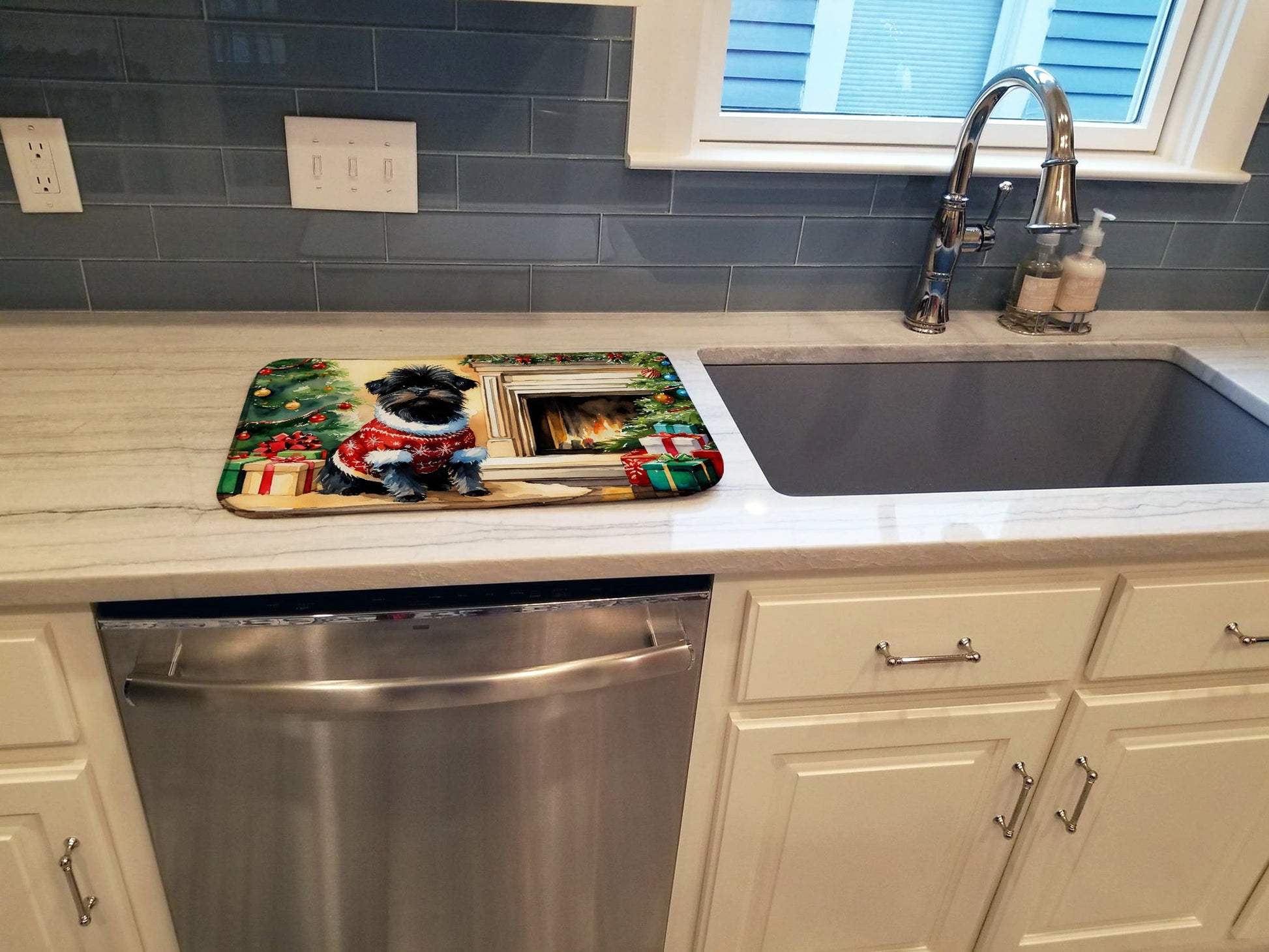 Dish Drying Mat featuring breed specific Affenpinscher artwork. Celebrate Christmas with this Christmas Dish Drying Mat. Say goodbye to messy countertops and soggy dish towels with our innovative dish drying mat. Our high-quality dish drying pad is designed to keep your countertops dry while offering a stylish and efficient solution. Whether you're air drying dishes, glasses, stemware, silverware, pots, pans, bottles, or even fruits and vegetables, our dish mat is the perfect choice. The 14 inches x 22 inches size fits most counters and dish drying racks, and the non-slip design ensures stability. Made with water-absorbent polyester and a polyurethane foam insert, our dish drying mat is not only functional but also durable. It's machine washable and printed in the USA for long-lasting use. The beautiful artwork adds flair to your kitchen decor, making it a perfect housewarming gift or present for any occasion. Upgrade your kitchen experience with our absorbent and versatile dish drying mat.