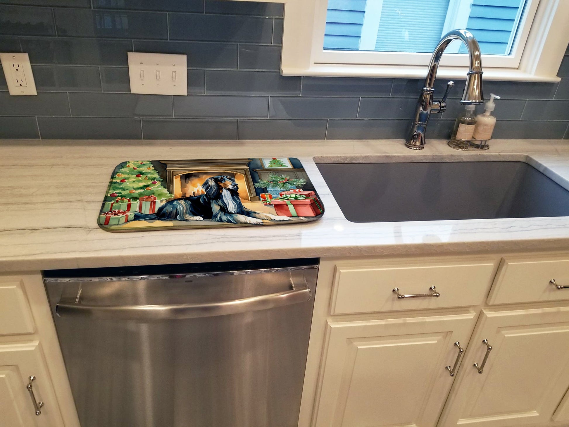 Dish Drying Mat featuring breed specific Afghan Hound artwork. Celebrate Christmas with this Christmas Dish Drying Mat. Say goodbye to messy countertops and soggy dish towels with our innovative dish drying mat. Our high-quality dish drying pad is designed to keep your countertops dry while offering a stylish and efficient solution. Whether you're air drying dishes, glasses, stemware, silverware, pots, pans, bottles, or even fruits and vegetables, our dish mat is the perfect choice. The 14 inches x 22 inches size fits most counters and dish drying racks, and the non-slip design ensures stability. Made with water-absorbent polyester and a polyurethane foam insert, our dish drying mat is not only functional but also durable. It's machine washable and printed in the USA for long-lasting use. The beautiful artwork adds flair to your kitchen decor, making it a perfect housewarming gift or present for any occasion. Upgrade your kitchen experience with our absorbent and versatile dish drying mat.