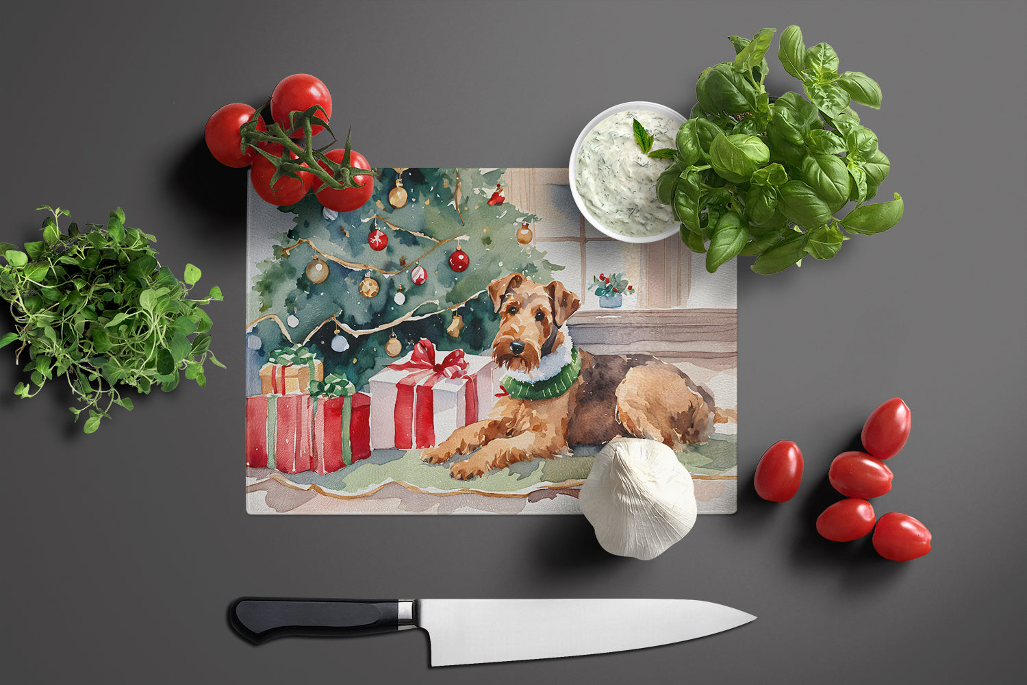 Airedale Terrier Cozy Christmas Glass Cutting Board