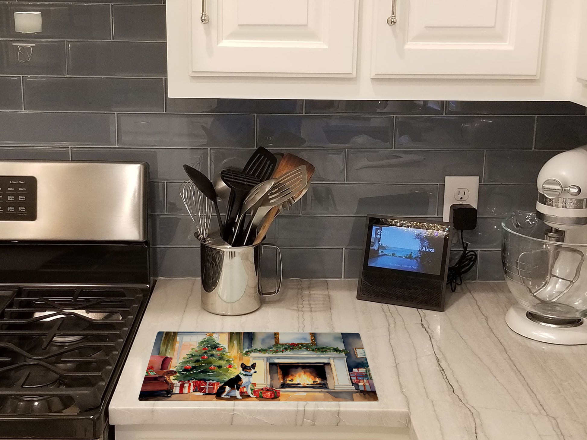 Glass Cutting Board featuring breed specific Basenji artwork. Celebrate Christmas with this Christmas Cutting Board. Introduce your kitchen to the vibrant, large Decorative Glass Cutting Board from Caroline's Treasures. Crafted from resilient tempered glass, this board is not only a utilitarian necessity but also a colorful art piece. With its generous dimensions of 15 inches in height and 12 inches in length, it offers ample space for all your cutting needs. Every piece showcases captivating artwork from distinguished artists, bringing an aesthetic edge to your kitchen. Beyond its attractive design, this cutting board ensures your countertop stays pristine and unscathed, owing to its heat-resistant properties. Engineered with user convenience in mind, it features non-skid feet for stability, and rounded corners for additional safety. Its robust construction renders it virtually unbreakable, guaranteeing longevity. The board comes with protective feet bumpers, maintaining its position during use. This product is recommended to be hand washed only. Proudly printed and assembled in the United States, this cutting board exemplifies superior craftsmanship. With Caroline's Treasures' Decorative Glass Cutting Board, you're investing in a blend of functionality and artistic flair.