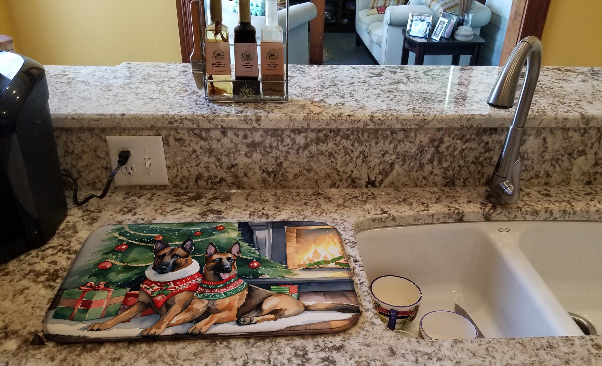 Dish Drying Mat featuring breed specific Belgian Malinois artwork. Celebrate Christmas with this Christmas Dish Drying Mat. Say goodbye to messy countertops and soggy dish towels with our innovative dish drying mat. Our high-quality dish drying pad is designed to keep your countertops dry while offering a stylish and efficient solution. Whether you're air drying dishes, glasses, stemware, silverware, pots, pans, bottles, or even fruits and vegetables, our dish mat is the perfect choice. The 14 inches x 22 inches size fits most counters and dish drying racks, and the non-slip design ensures stability. Made with water-absorbent polyester and a polyurethane foam insert, our dish drying mat is not only functional but also durable. It's machine washable and printed in the USA for long-lasting use. The beautiful artwork adds flair to your kitchen decor, making it a perfect housewarming gift or present for any occasion. Upgrade your kitchen experience with our absorbent and versatile dish drying mat.