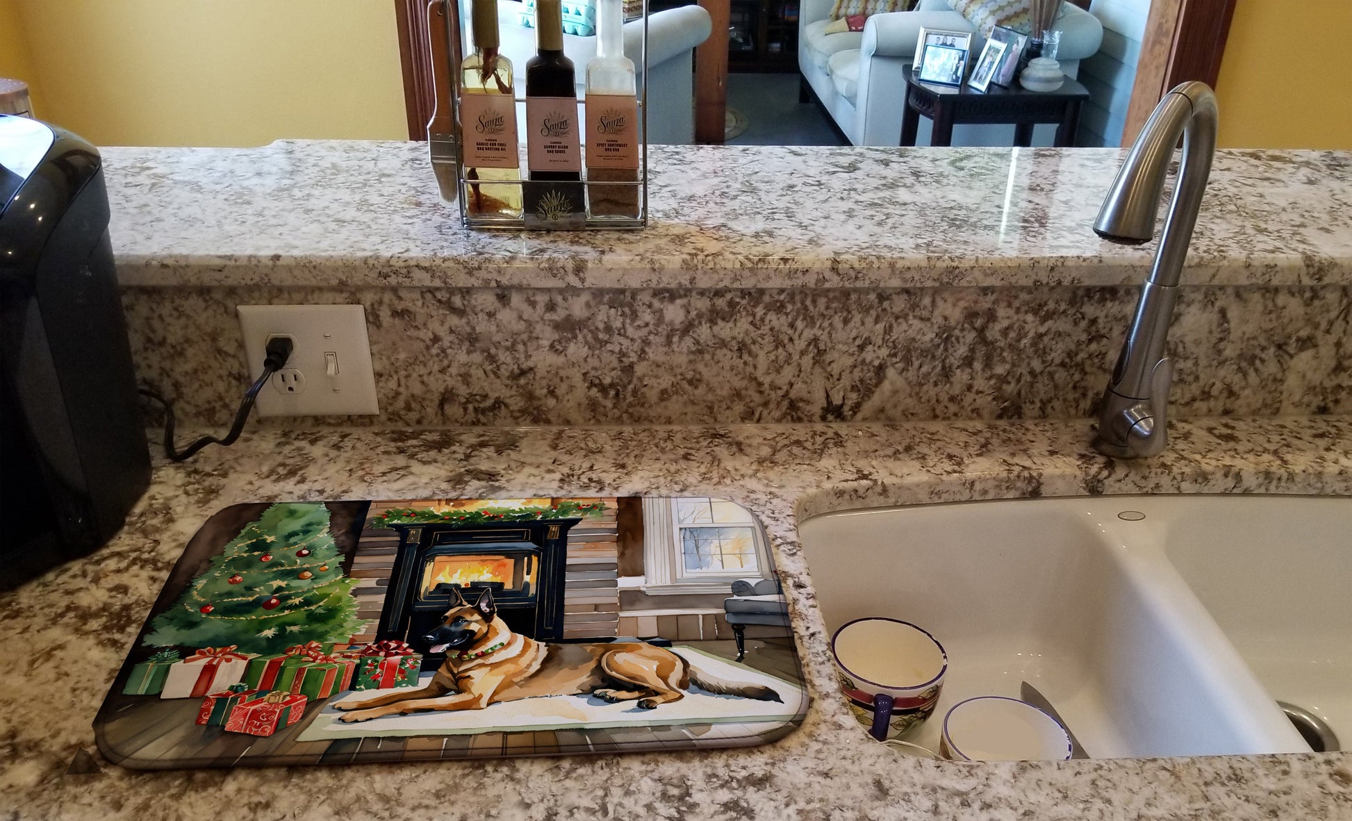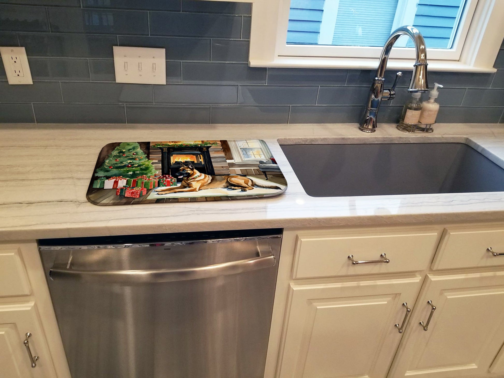 Dish Drying Mat featuring breed specific Belgian Malinois artwork. Celebrate Christmas with this Christmas Dish Drying Mat. Say goodbye to messy countertops and soggy dish towels with our innovative dish drying mat. Our high-quality dish drying pad is designed to keep your countertops dry while offering a stylish and efficient solution. Whether you're air drying dishes, glasses, stemware, silverware, pots, pans, bottles, or even fruits and vegetables, our dish mat is the perfect choice. The 14 inches x 22 inches size fits most counters and dish drying racks, and the non-slip design ensures stability. Made with water-absorbent polyester and a polyurethane foam insert, our dish drying mat is not only functional but also durable. It's machine washable and printed in the USA for long-lasting use. The beautiful artwork adds flair to your kitchen decor, making it a perfect housewarming gift or present for any occasion. Upgrade your kitchen experience with our absorbent and versatile dish drying mat.
