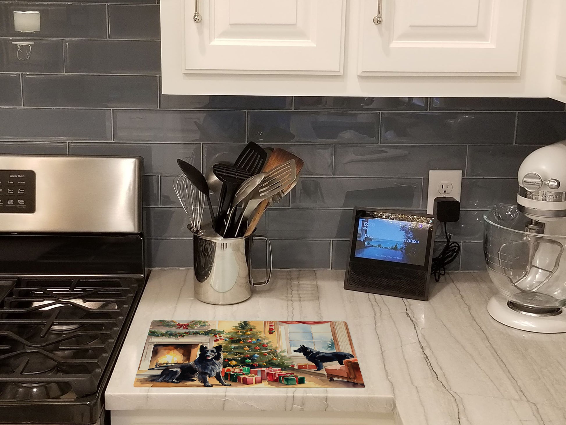 Glass Cutting Board featuring breed specific Belgian Sheepdog artwork. Celebrate Christmas with this Christmas Cutting Board. Introduce your kitchen to the vibrant, large Decorative Glass Cutting Board from Caroline's Treasures. Crafted from resilient tempered glass, this board is not only a utilitarian necessity but also a colorful art piece. With its generous dimensions of 15 inches in height and 12 inches in length, it offers ample space for all your cutting needs. Every piece showcases captivating artwork from distinguished artists, bringing an aesthetic edge to your kitchen. Beyond its attractive design, this cutting board ensures your countertop stays pristine and unscathed, owing to its heat-resistant properties. Engineered with user convenience in mind, it features non-skid feet for stability, and rounded corners for additional safety. Its robust construction renders it virtually unbreakable, guaranteeing longevity. The board comes with protective feet bumpers, maintaining its position during use. This product is recommended to be hand washed only. Proudly printed and assembled in the United States, this cutting board exemplifies superior craftsmanship. With Caroline's Treasures' Decorative Glass Cutting Board, you're investing in a blend of functionality and artistic flair.
