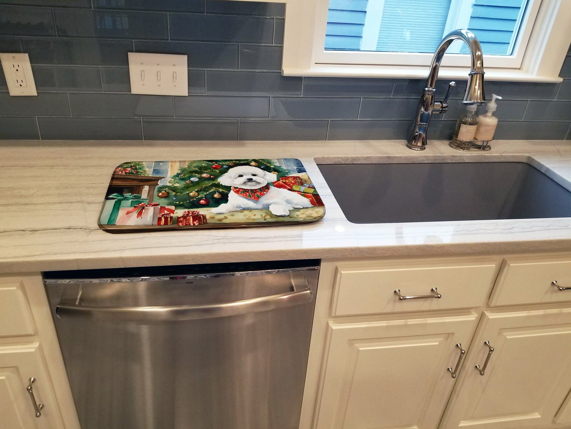 Dish Drying Mat featuring breed specific Bichon Frise artwork. Celebrate Christmas with this Christmas Dish Drying Mat. Say goodbye to messy countertops and soggy dish towels with our innovative dish drying mat. Our high-quality dish drying pad is designed to keep your countertops dry while offering a stylish and efficient solution. Whether you're air drying dishes, glasses, stemware, silverware, pots, pans, bottles, or even fruits and vegetables, our dish mat is the perfect choice. The 14 inches x 22 inches size fits most counters and dish drying racks, and the non-slip design ensures stability. Made with water-absorbent polyester and a polyurethane foam insert, our dish drying mat is not only functional but also durable. It's machine washable and printed in the USA for long-lasting use. The beautiful artwork adds flair to your kitchen decor, making it a perfect housewarming gift or present for any occasion. Upgrade your kitchen experience with our absorbent and versatile dish drying mat.