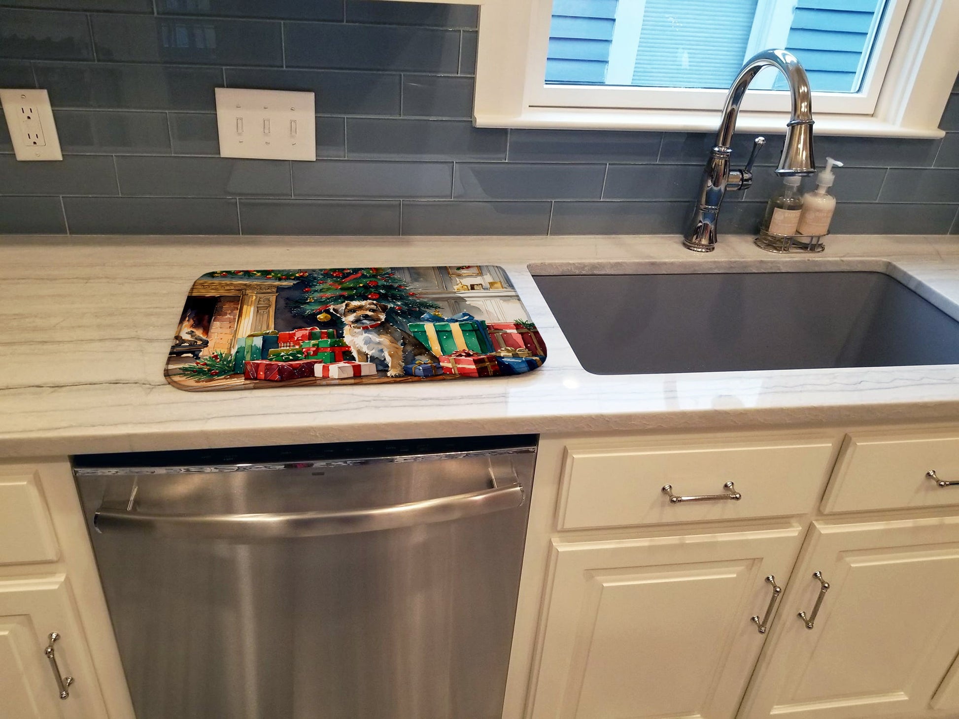 Dish Drying Mat featuring breed specific Border Terrier artwork. Celebrate Christmas with this Christmas Dish Drying Mat. Say goodbye to messy countertops and soggy dish towels with our innovative dish drying mat. Our high-quality dish drying pad is designed to keep your countertops dry while offering a stylish and efficient solution. Whether you're air drying dishes, glasses, stemware, silverware, pots, pans, bottles, or even fruits and vegetables, our dish mat is the perfect choice. The 14 inches x 22 inches size fits most counters and dish drying racks, and the non-slip design ensures stability. Made with water-absorbent polyester and a polyurethane foam insert, our dish drying mat is not only functional but also durable. It's machine washable and printed in the USA for long-lasting use. The beautiful artwork adds flair to your kitchen decor, making it a perfect housewarming gift or present for any occasion. Upgrade your kitchen experience with our absorbent and versatile dish drying mat.