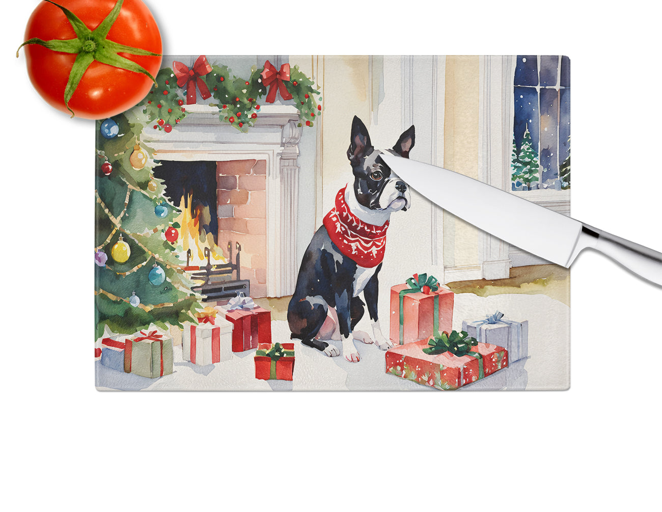 Glass Cutting Board featuring breed specific Boston Terrier artwork. Celebrate Christmas with this Christmas Cutting Board. Introduce your kitchen to the vibrant, large Decorative Glass Cutting Board from Caroline's Treasures. Crafted from resilient tempered glass, this board is not only a utilitarian necessity but also a colorful art piece. With its generous dimensions of 15 inches in height and 12 inches in length, it offers ample space for all your cutting needs. Every piece showcases captivating artwork from distinguished artists, bringing an aesthetic edge to your kitchen. Beyond its attractive design, this cutting board ensures your countertop stays pristine and unscathed, owing to its heat-resistant properties. Engineered with user convenience in mind, it features non-skid feet for stability, and rounded corners for additional safety. Its robust construction renders it virtually unbreakable, guaranteeing longevity. The board comes with protective feet bumpers, maintaining its position during use. This product is recommended to be hand washed only. Proudly printed and assembled in the United States, this cutting board exemplifies superior craftsmanship. With Caroline's Treasures' Decorative Glass Cutting Board, you're investing in a blend of functionality and artistic flair.