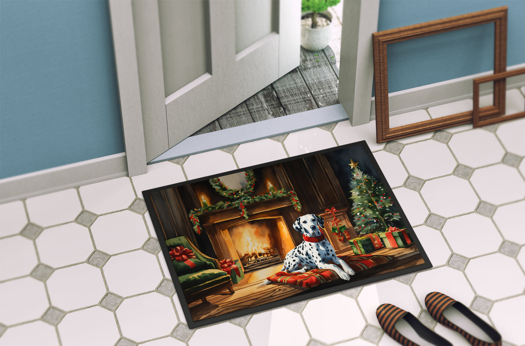 Doormat featuring breed specific Dalmatian artwork. Celebrate Christmas with this Christmas Doormat. Welcome your guests in style with our Artwork Door Mat, designed to withstand almost any weather condition. This mat, measuring approximately 18 by 27 inches, is held together by durable black binding tape. Its top layer, composed of polyester felt, is dyed with the eye-catching image you see on the mat. A few layers below provide the mat with stability, while its rubber bottom is stamped to help prevent slipping and ensures safety. Our mat works wonderfully as both an indoor or outdoor door mat. For cleaning, simply hose it off with water or use a power washer - no need for any cleaner that produces suds. Avoid scrubbing with a brush, instead, opt for the vacuum on floor setting. Designed manufactured and printed in the USA, this mat is a perfect addition to your porch, outdoor kitchen, entryway, or any indoor space. Its unique design makes it a charming decorative rug that greets your guests and adds a stylish touch to your home decor.