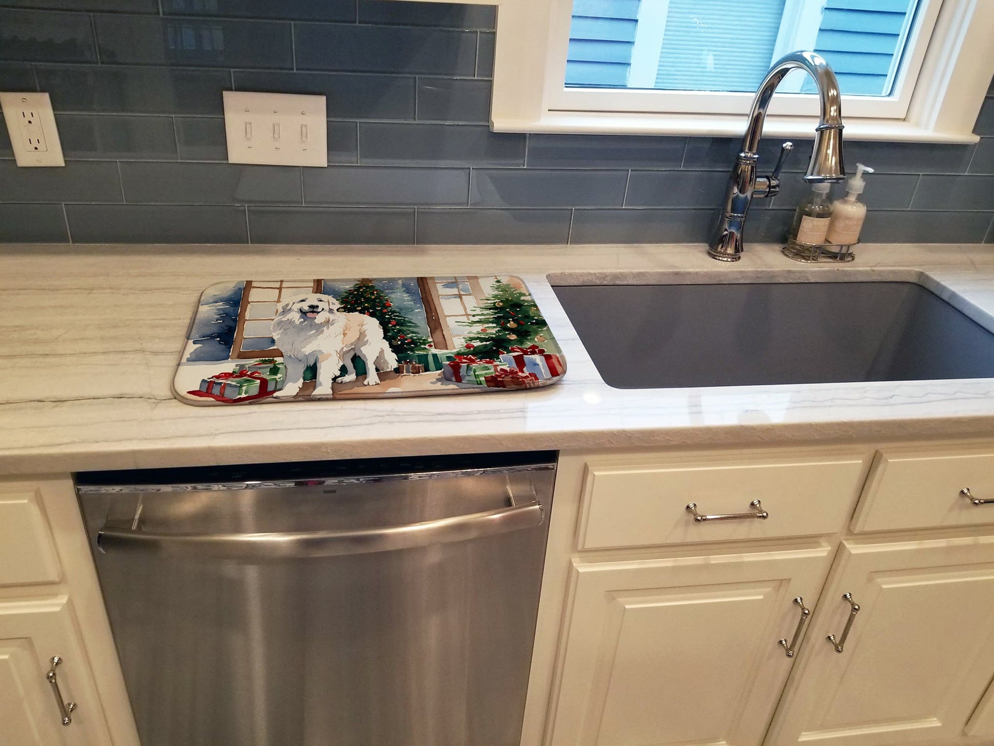 Dish Drying Mat featuring breed specific Great Pyrenees artwork. Celebrate Christmas with this Christmas Dish Drying Mat. Say goodbye to messy countertops and soggy dish towels with our innovative dish drying mat. Our high-quality dish drying pad is designed to keep your countertops dry while offering a stylish and efficient solution. Whether you're air drying dishes, glasses, stemware, silverware, pots, pans, bottles, or even fruits and vegetables, our dish mat is the perfect choice. The 14 inches x 22 inches size fits most counters and dish drying racks, and the non-slip design ensures stability. Made with water-absorbent polyester and a polyurethane foam insert, our dish drying mat is not only functional but also durable. It's machine washable and printed in the USA for long-lasting use. The beautiful artwork adds flair to your kitchen decor, making it a perfect housewarming gift or present for any occasion. Upgrade your kitchen experience with our absorbent and versatile dish drying mat.