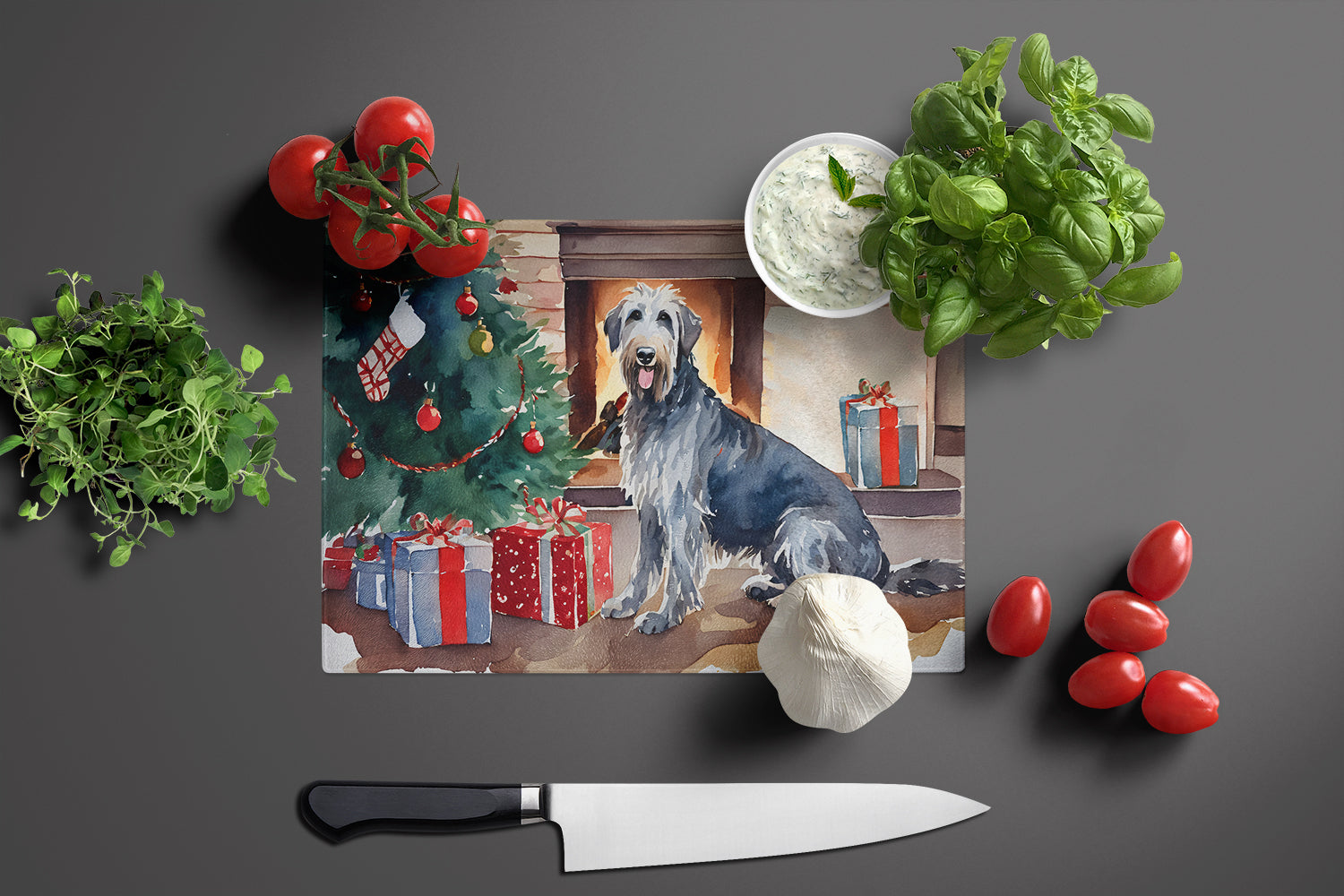 Glass Cutting Board featuring breed specific Irish Wolfhound artwork. Celebrate Christmas with this Christmas Cutting Board. Introduce your kitchen to the vibrant, large Decorative Glass Cutting Board from Caroline's Treasures. Crafted from resilient tempered glass, this board is not only a utilitarian necessity but also a colorful art piece. With its generous dimensions of 15 inches in height and 12 inches in length, it offers ample space for all your cutting needs. Every piece showcases captivating artwork from distinguished artists, bringing an aesthetic edge to your kitchen. Beyond its attractive design, this cutting board ensures your countertop stays pristine and unscathed, owing to its heat-resistant properties. Engineered with user convenience in mind, it features non-skid feet for stability, and rounded corners for additional safety. Its robust construction renders it virtually unbreakable, guaranteeing longevity. The board comes with protective feet bumpers, maintaining its position during use. This product is recommended to be hand washed only. Proudly printed and assembled in the United States, this cutting board exemplifies superior craftsmanship. With Caroline's Treasures' Decorative Glass Cutting Board, you're investing in a blend of functionality and artistic flair.