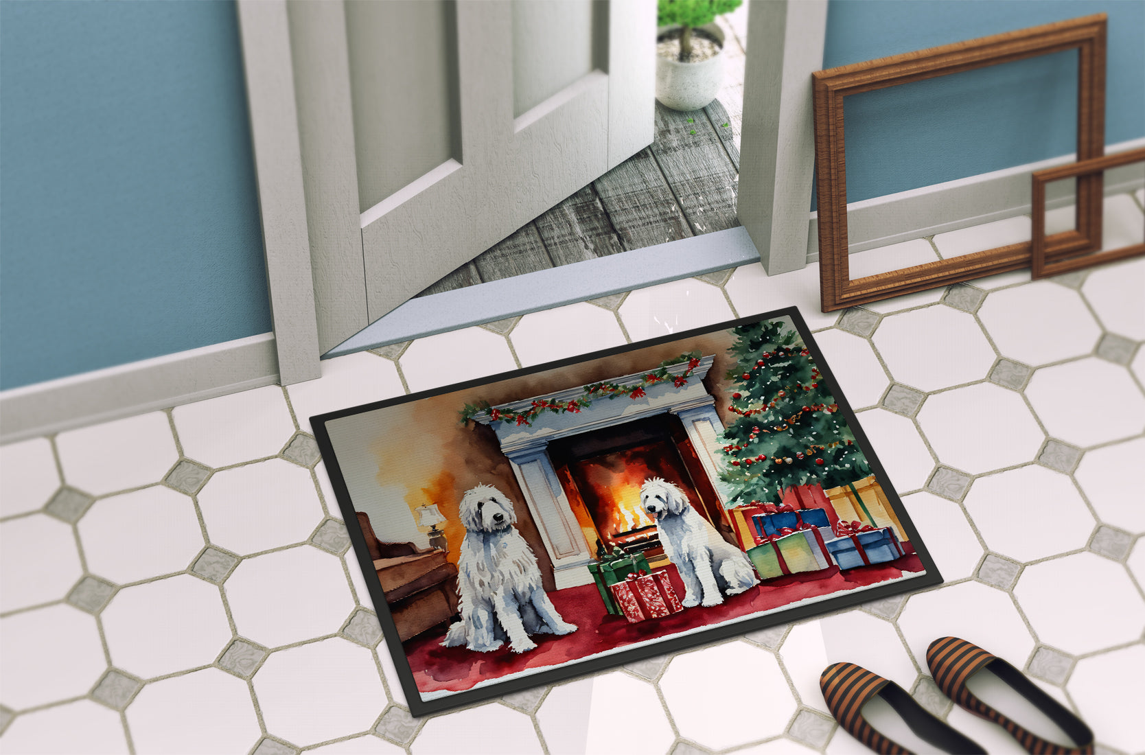 Doormat featuring breed specific Komondor artwork. Celebrate Christmas with this Christmas Doormat. Welcome your guests in style with our Artwork Door Mat, designed to withstand almost any weather condition. This mat, measuring approximately 24 by 36 inches, is held together by durable black binding tape. Its top layer, composed of polyester felt, is dyed with the eye-catching image you see on the mat. A few layers below provide the mat with stability, while its rubber bottom is stamped to help prevent slipping and ensures safety. Our mat works wonderfully as both an indoor or outdoor door mat. For cleaning, simply hose it off with water or use a power washer - no need for any cleaner that produces suds. Avoid scrubbing with a brush, instead, opt for the vacuum on floor setting. Designed manufactured and printed in the USA, this mat is a perfect addition to your porch, outdoor kitchen, entryway, or any indoor space. Its unique design makes it a charming decorative rug that greets your guests and adds a stylish touch to your home decor.