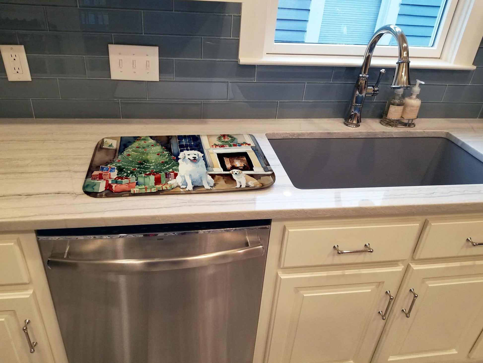 Dish Drying Mat featuring breed specific Kuvasz artwork. Celebrate Christmas with this Christmas Dish Drying Mat. Say goodbye to messy countertops and soggy dish towels with our innovative dish drying mat. Our high-quality dish drying pad is designed to keep your countertops dry while offering a stylish and efficient solution. Whether you're air drying dishes, glasses, stemware, silverware, pots, pans, bottles, or even fruits and vegetables, our dish mat is the perfect choice. The 14 inches x 22 inches size fits most counters and dish drying racks, and the non-slip design ensures stability. Made with water-absorbent polyester and a polyurethane foam insert, our dish drying mat is not only functional but also durable. It's machine washable and printed in the USA for long-lasting use. The beautiful artwork adds flair to your kitchen decor, making it a perfect housewarming gift or present for any occasion. Upgrade your kitchen experience with our absorbent and versatile dish drying mat.