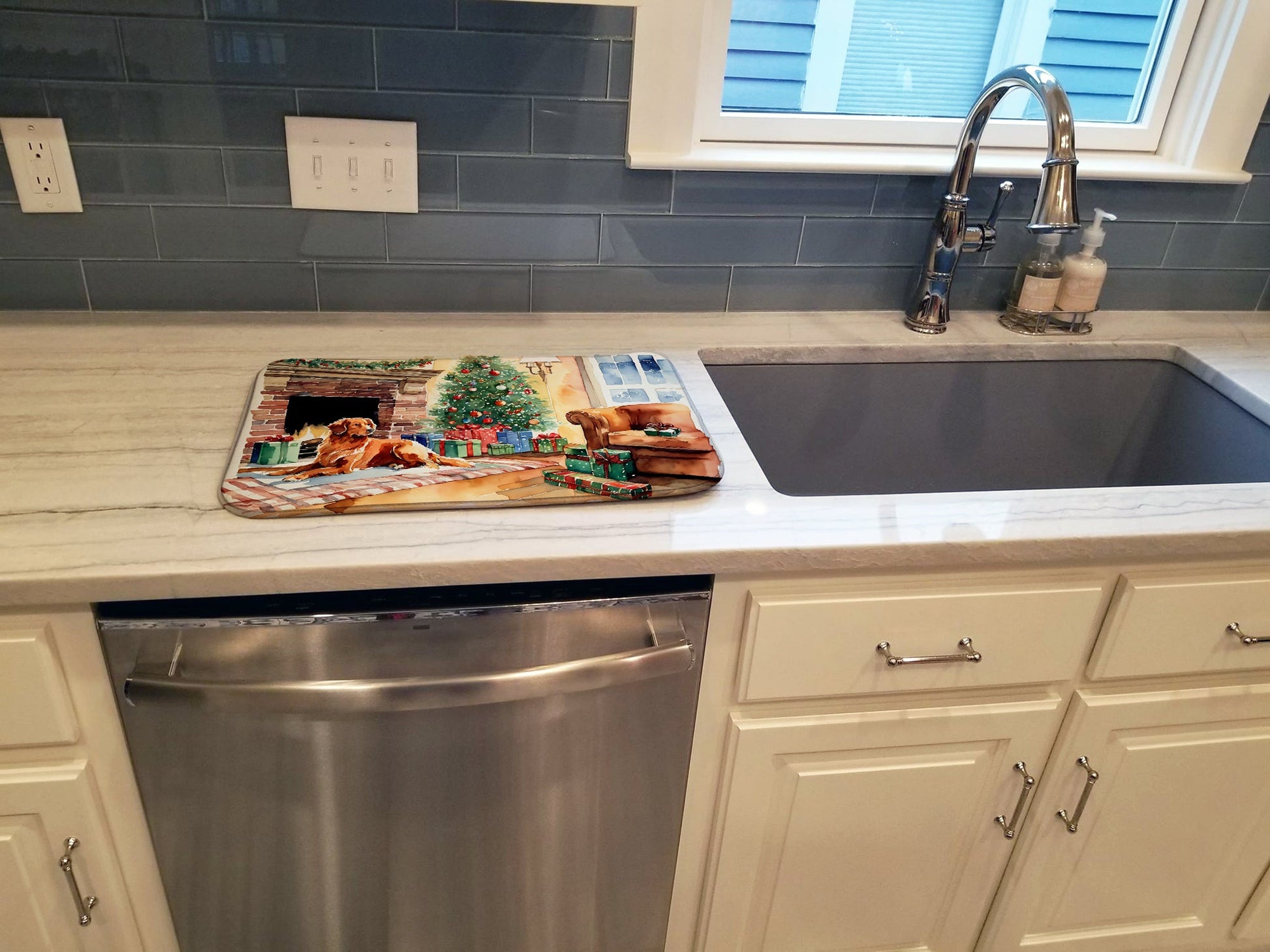 Dish Drying Mat featuring breed specific Nova Scotia Duck Tolling Retriever artwork. Celebrate Christmas with this Christmas Dish Drying Mat. Say goodbye to messy countertops and soggy dish towels with our innovative dish drying mat. Our high-quality dish drying pad is designed to keep your countertops dry while offering a stylish and efficient solution. Whether you're air drying dishes, glasses, stemware, silverware, pots, pans, bottles, or even fruits and vegetables, our dish mat is the perfect choice. The 14 inches x 22 inches size fits most counters and dish drying racks, and the non-slip design ensures stability. Made with water-absorbent polyester and a polyurethane foam insert, our dish drying mat is not only functional but also durable. It's machine washable and printed in the USA for long-lasting use. The beautiful artwork adds flair to your kitchen decor, making it a perfect housewarming gift or present for any occasion. Upgrade your kitchen experience with our absorbent and versatile dish drying mat.
