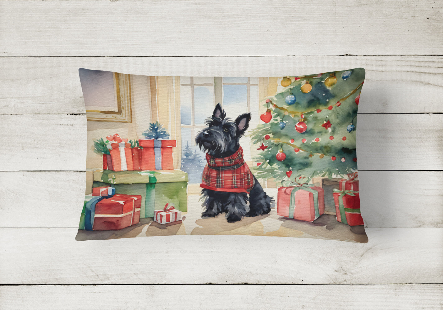 Throw Pillow featuring breed specific Scottie or Scottish Terrier artwork. Celebrate Christmas with this Christmas Pillow. Embrace the fusion of comfort and style with Caroline's Treasures Fabric Decorative Pillow. This 12x16 inch outdoor pillow is designed to complement your patio furniture, adding a splash of color and artistry to your outdoor setting. Constructed with a 100% Polyester Fabric pillow sham filled with a plush pillow form, this cushion is as comfortable as it is durable. Our outdoor pillow utilizes a novel fabric, meticulously woven for enhanced water resistance. This soft canvas material is equally suited for your indoor couch as well as outdoor settings such as the patio, porch, or veranda. To ensure enduring vibrance, we employ colorfast dyes resistant to fading even when subjected to weather elements. The making of this pillow involves the delicate sewing together of three fabric pieces to create a sham, into which a polyester insert is carefully placed. The result is an overstuffed pillow that tenaciously holds its shape. With both the sham and the pillow insert crafted in the United States, these handmade pillows are a testament to superior local craftsmanship. Note that as these pillows are handmade, sizes may slightly vary, enhancing their unique appeal. Enjoy comfort in style with Caroline's Treasures Fabric Decorative Pillow.