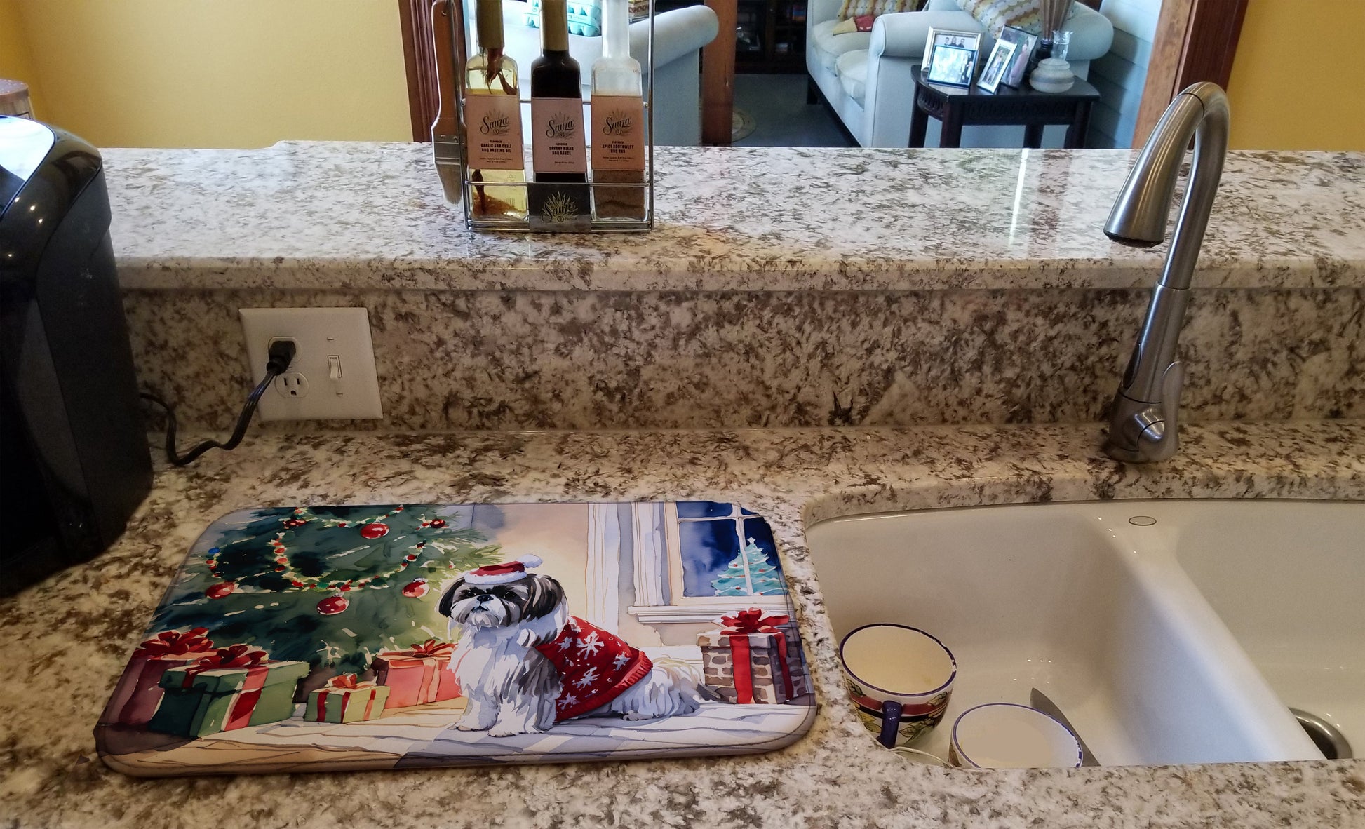 Dish Drying Mat featuring breed specific Shih Tzu artwork. Celebrate Christmas with this Christmas Dish Drying Mat. Say goodbye to messy countertops and soggy dish towels with our innovative dish drying mat. Our high-quality dish drying pad is designed to keep your countertops dry while offering a stylish and efficient solution. Whether you're air drying dishes, glasses, stemware, silverware, pots, pans, bottles, or even fruits and vegetables, our dish mat is the perfect choice. The 14 inches x 22 inches size fits most counters and dish drying racks, and the non-slip design ensures stability. Made with water-absorbent polyester and a polyurethane foam insert, our dish drying mat is not only functional but also durable. It's machine washable and printed in the USA for long-lasting use. The beautiful artwork adds flair to your kitchen decor, making it a perfect housewarming gift or present for any occasion. Upgrade your kitchen experience with our absorbent and versatile dish drying mat.