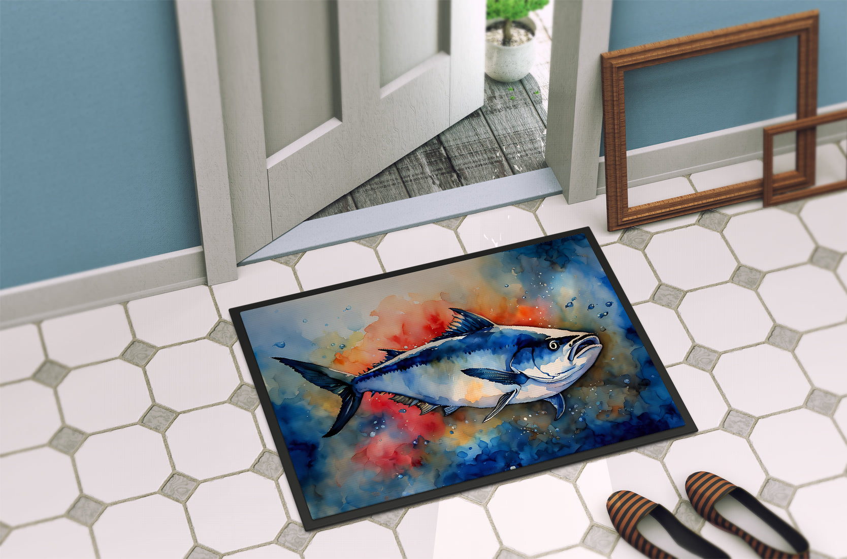 Doormat featuring breed specific Bluefin Tuna artwork. Welcome your guests in style with our Artwork Door Mat, designed to withstand almost any weather condition. This mat, measuring approximately 24 by 36 inches, is held together by durable black binding tape. Its top layer, composed of polyester felt, is dyed with the eye-catching image you see on the mat. A few layers below provide the mat with stability, while its rubber bottom is stamped to help prevent slipping and ensures safety. Our mat works wonderfully as both an indoor or outdoor door mat. For cleaning, simply hose it off with water or use a power washer - no need for any cleaner that produces suds. Avoid scrubbing with a brush, instead, opt for the vacuum on floor setting. Designed manufactured and printed in the USA, this mat is a perfect addition to your porch, outdoor kitchen, entryway, or any indoor space. Its unique design makes it a charming decorative rug that greets your guests and adds a stylish touch to your home decor.