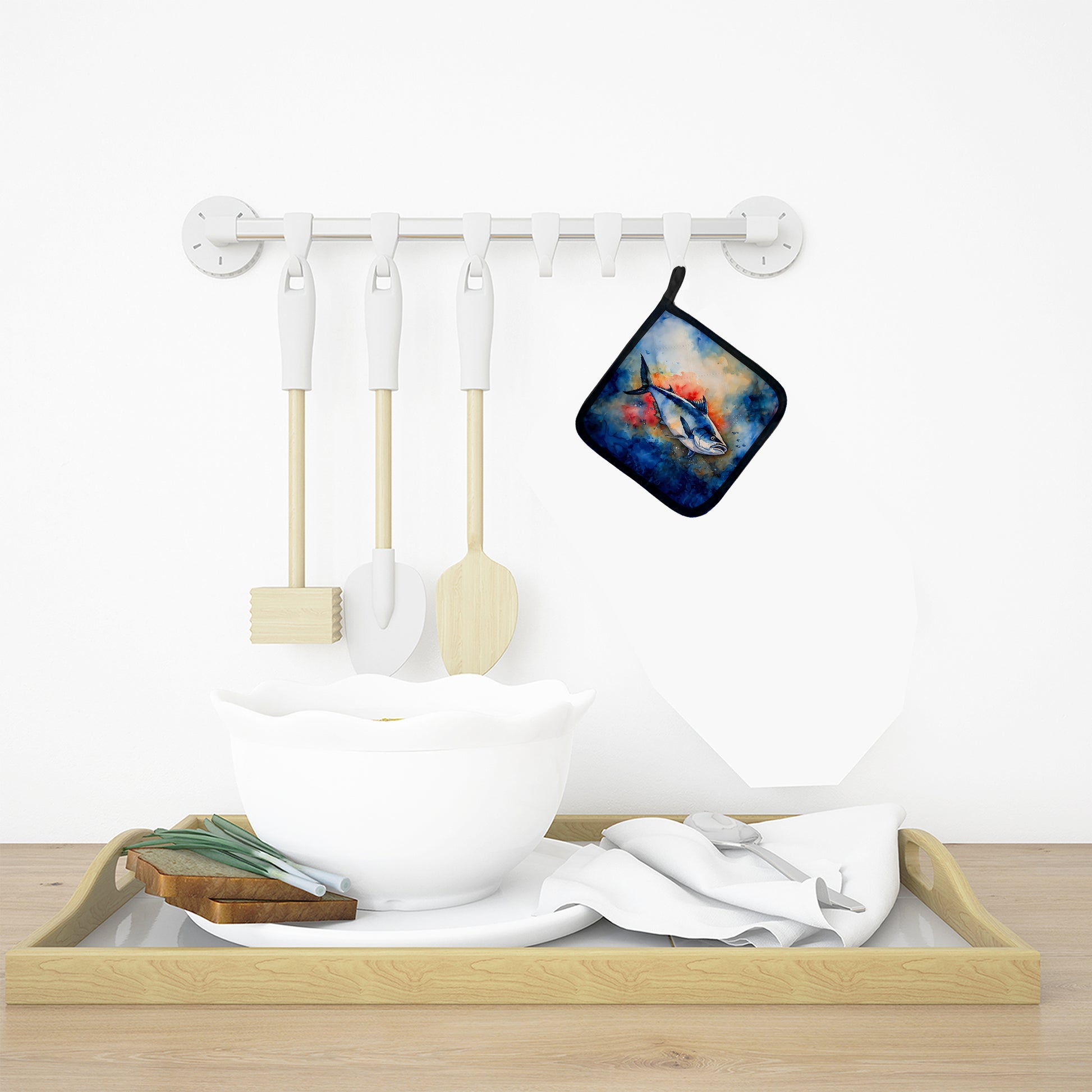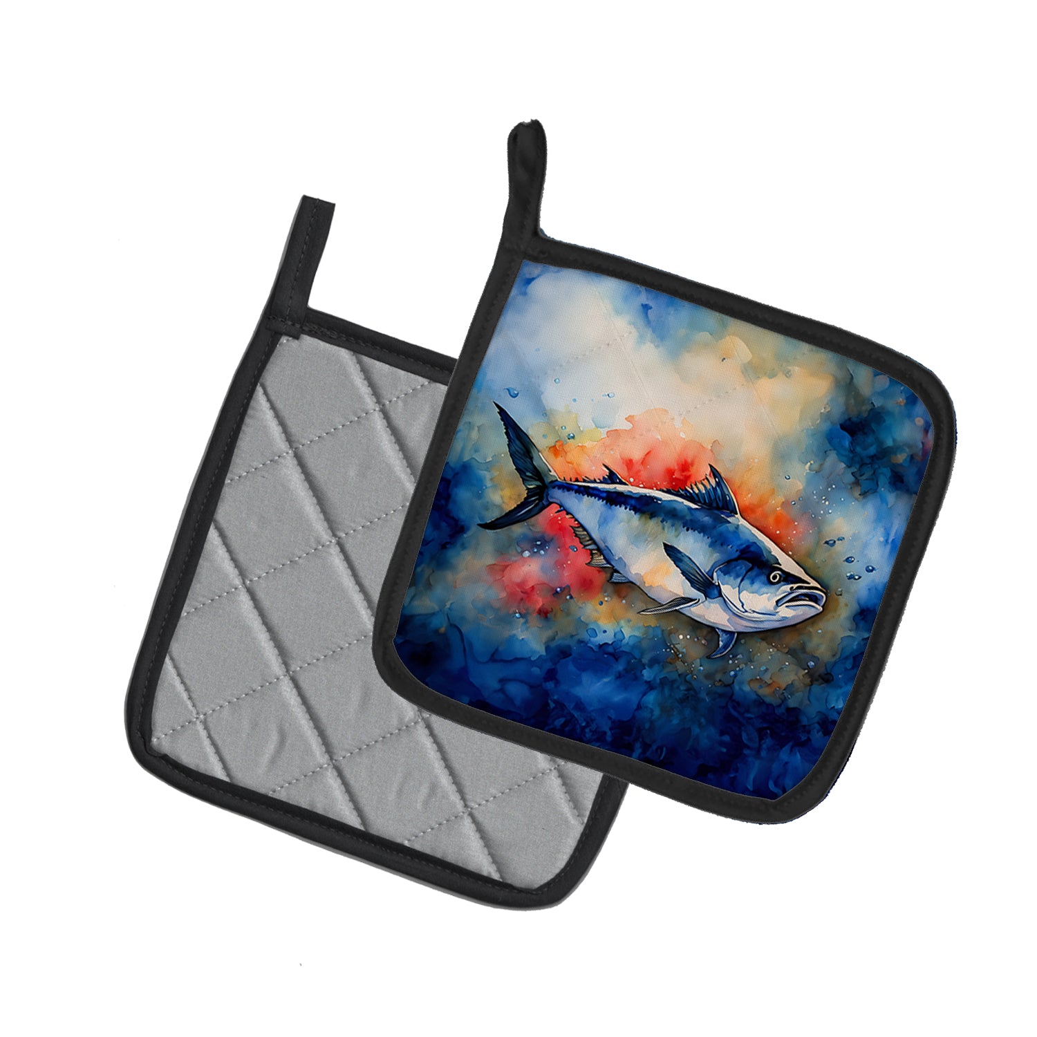 Pair of Pot Holders featuring breed specific Bluefin Tuna artwork. A Pair of Pot Holders to match your kitchen decor. Made in the USA these are thick and functional. Full color artwork decorates the front polyester fabric of the hot pad and accented by a black trim. Use these at as a trivet for your Thanksgiving or Christmas tablescape. Filled with insulated fabric and quilted for durability. These colorful pot holders will make a great gift for your favorite home cook or executive chef. Each pot holder measures approximately 7 1/2 inches by 7 1/2 inches. A hanging tab is included.
