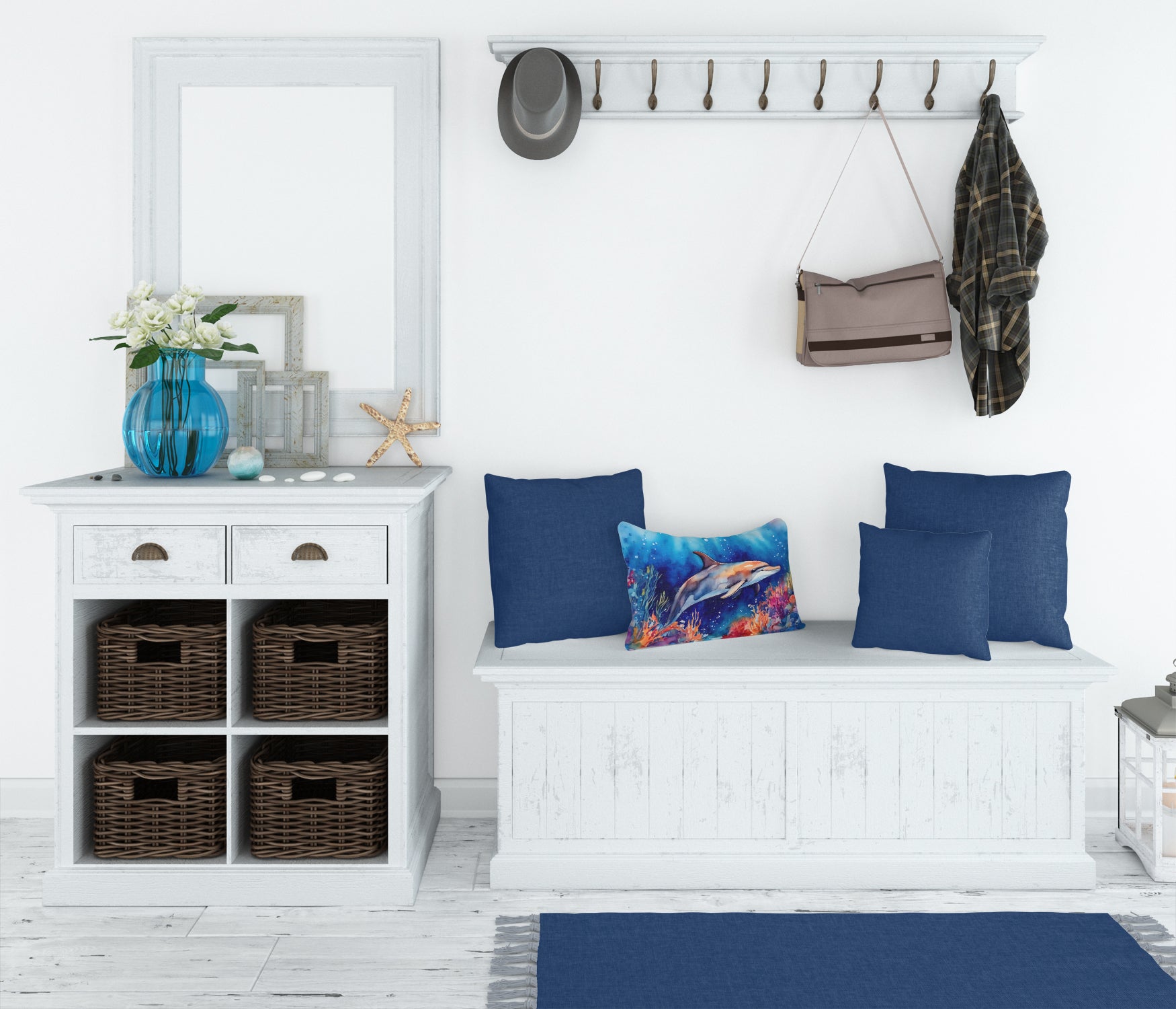 Throw Pillow featuring breed specific Dolphin artwork. Embrace the fusion of comfort and style with Caroline's Treasures Fabric Decorative Pillow. This 12x16 inch outdoor pillow is designed to complement your patio furniture, adding a splash of color and artistry to your outdoor setting. Constructed with a 100% Polyester Fabric pillow sham filled with a plush pillow form, this cushion is as comfortable as it is durable. Our outdoor pillow utilizes a novel fabric, meticulously woven for enhanced water resistance. This soft canvas material is equally suited for your indoor couch as well as outdoor settings such as the patio, porch, or veranda. To ensure enduring vibrance, we employ colorfast dyes resistant to fading even when subjected to weather elements. The making of this pillow involves the delicate sewing together of three fabric pieces to create a sham, into which a polyester insert is carefully placed. The result is an overstuffed pillow that tenaciously holds its shape. With both the sham and the pillow insert crafted in the United States, these handmade pillows are a testament to superior local craftsmanship. Note that as these pillows are handmade, sizes may slightly vary, enhancing their unique appeal. Enjoy comfort in style with Caroline's Treasures Fabric Decorative Pillow.