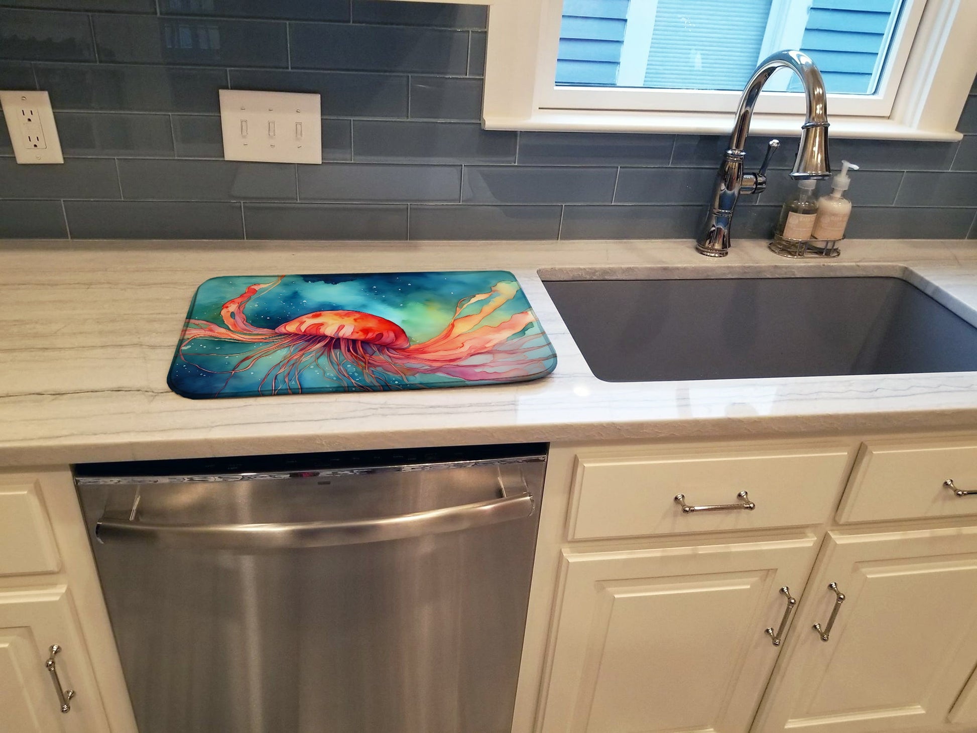 Dish Drying Mat featuring breed specific Jellyfish artwork. Say goodbye to messy countertops and soggy dish towels with our innovative dish drying mat. Our high-quality dish drying pad is designed to keep your countertops dry while offering a stylish and efficient solution. Whether you're air drying dishes, glasses, stemware, silverware, pots, pans, bottles, or even fruits and vegetables, our dish mat is the perfect choice. The 14 inches x 22 inches size fits most counters and dish drying racks, and the non-slip design ensures stability. Made with water-absorbent polyester and a polyurethane foam insert, our dish drying mat is not only functional but also durable. It's machine washable and printed in the USA for long-lasting use. The beautiful artwork adds flair to your kitchen decor, making it a perfect housewarming gift or present for any occasion. Upgrade your kitchen experience with our absorbent and versatile dish drying mat.