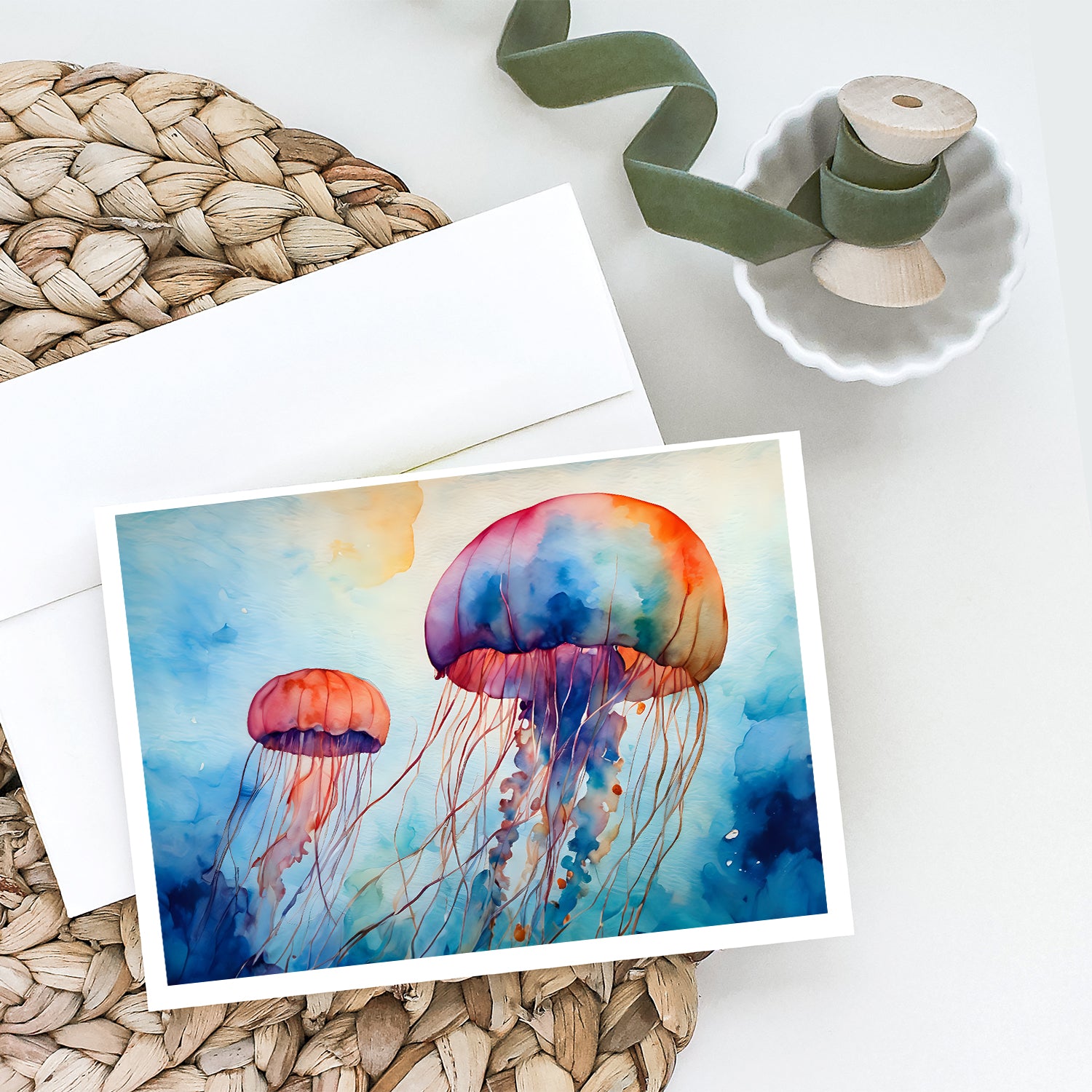 Greeting Cards Pack of 8 featuring breed specific Jellyfish artwork. Celebrate special moments with Caroline's Treasures Printed Greeting Card Pack. This pack includes eight beautifully folded 5x7 cards, accompanied by eight matching white envelopes. With blank interiors, these cards provide ample space for your personalized messages and heartfelt holiday greetings. Each card features captivating full-color artwork, meticulously printed in our facility on high-quality 80 lb cover stock or 216 GSM. The super smooth finish of the white cards enhances the visual impact of the artwork, creating a truly stunning presentation. Designed by our talented in-house artists or licensed artists, the artwork on these cards showcases their creativity and attention to detail. From vibrant illustrations to captivating designs, each card tells its own unique story. Whether it's for birthdays, anniversaries, holidays, or any special occasion, Caroline's Treasures Greeting Card Pack is the perfect way to convey your heartfelt sentiments. Share joy, love, and warm wishes with these exquisite cards and make every moment unforgettable.