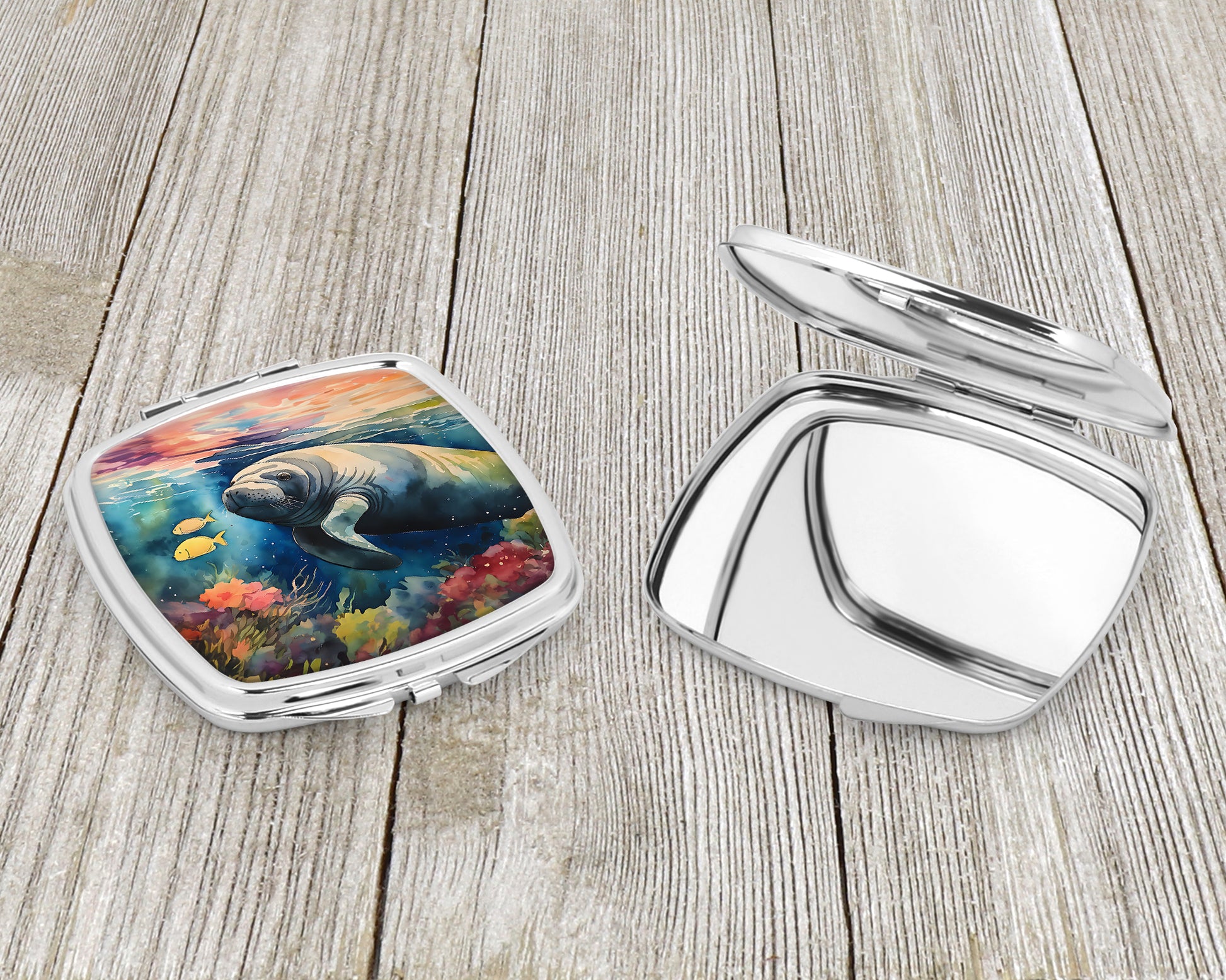 Compact Mirror featuring breed specific Manatee artwork. Introducing our Square Compact Mirror, a blend of elegance, functionality, and compactness, perfect for on-the-go touch-ups. This Silvertone metal mirror, with dimensions of 2.75 inches x 3 inches x .3 inches, fits effortlessly into your purse, handbag, or pocket, ensuring that you can check your appearance anytime, anywhere. Our compact mirror stands out with its eye-catching artwork on the front, adding a dash of style to this practical accessory. It is more than just a mirror; it's a statement piece that reflects your personality and aesthetic. When opened, this compact reveals two mirrors inside, doubling your perspective for precise touch-ups. The Silvertone metal construction ensures durability while maintaining a lightweight feel, making it an ideal everyday carry item. Whether you're rushing to a meeting, prepping for a dinner date, or just need a quick check on your look, our Square Compact Mirror is your reliable companion. Experience the perfect blend of style and practicality with this must-have accessory.