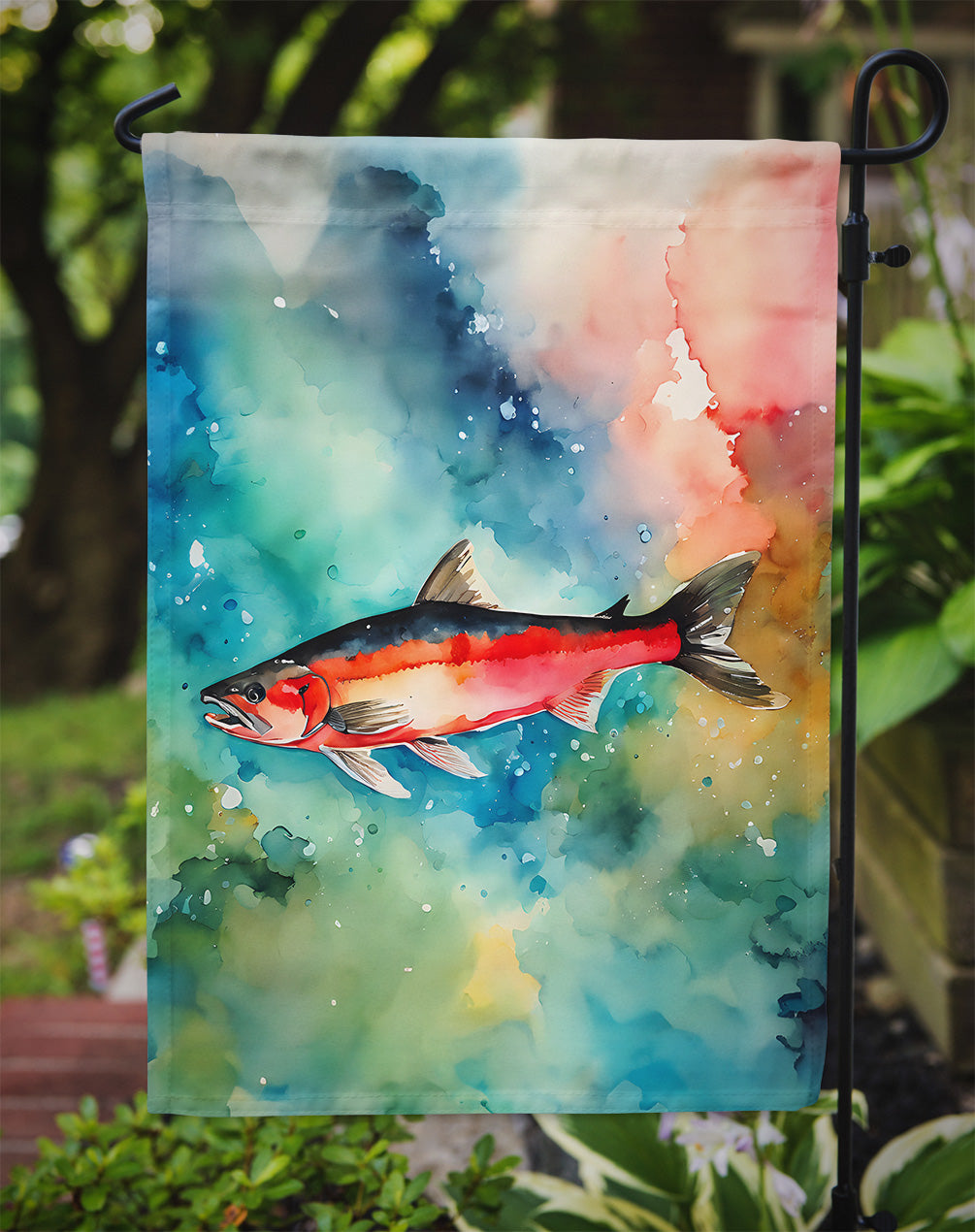 Garden Flag featuring breed specific Salmon artwork. Enhance the beauty of your garden, patio, or yard with Caroline's Treasures Decorative Garden Flag, proudly made in the USA. Crafted from two pieces of thick, double-sided polyester fabric, this 2-ply garden flag is designed to withstand various weather conditions, making it water-resistant and weatherproof. Featuring correctly readable words on both sides, this garden flag offers a delightful visual experience from any angle. With its heavier weight, it stands out among other garden flags, ensuring stability and durability even in wind, rain, and snow. Measuring approximately 11 1/4 inches by 15 1/2 inches, this flag allows you to personalize your outdoor decor. It comes with a 1 1/2-inch sleeve sewn in, allowing easy attachment to any standard garden flag stand or garden size porch hanger (sold separately). Make a statement in your outdoor space with Caroline's Treasures Decorative Garden Flag, a vibrant and high-quality flag that adds color and personality to your surroundings. Proudly made in the USA, it's a symbol of quality craftsmanship and attention to detail.