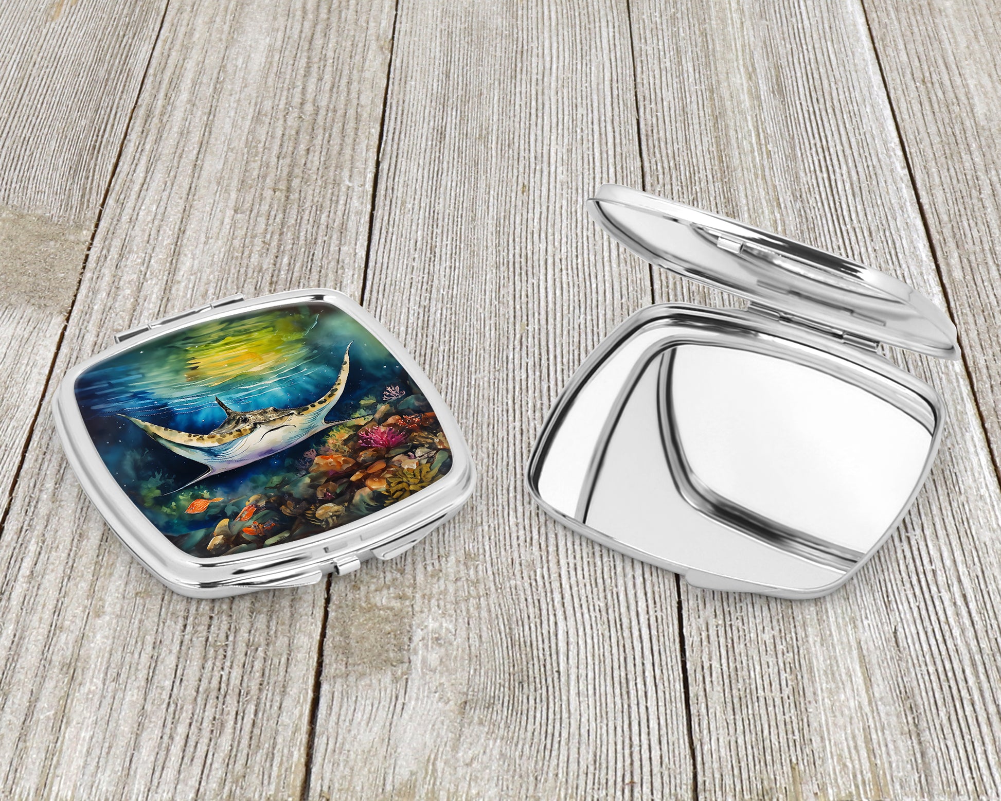 Compact Mirror featuring breed specific Sting Ray artwork. Introducing our Square Compact Mirror, a blend of elegance, functionality, and compactness, perfect for on-the-go touch-ups. This Silvertone metal mirror, with dimensions of 2.75 inches x 3 inches x .3 inches, fits effortlessly into your purse, handbag, or pocket, ensuring that you can check your appearance anytime, anywhere. Our compact mirror stands out with its eye-catching artwork on the front, adding a dash of style to this practical accessory. It is more than just a mirror; it's a statement piece that reflects your personality and aesthetic. When opened, this compact reveals two mirrors inside, doubling your perspective for precise touch-ups. The Silvertone metal construction ensures durability while maintaining a lightweight feel, making it an ideal everyday carry item. Whether you're rushing to a meeting, prepping for a dinner date, or just need a quick check on your look, our Square Compact Mirror is your reliable companion. Experience the perfect blend of style and practicality with this must-have accessory.