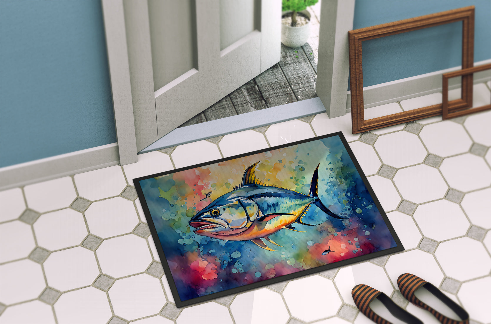 Doormat featuring breed specific Yellowfin Tuna artwork. Welcome your guests in style with our Artwork Door Mat, designed to withstand almost any weather condition. This mat, measuring approximately 24 by 36 inches, is held together by durable black binding tape. Its top layer, composed of polyester felt, is dyed with the eye-catching image you see on the mat. A few layers below provide the mat with stability, while its rubber bottom is stamped to help prevent slipping and ensures safety. Our mat works wonderfully as both an indoor or outdoor door mat. For cleaning, simply hose it off with water or use a power washer - no need for any cleaner that produces suds. Avoid scrubbing with a brush, instead, opt for the vacuum on floor setting. Designed manufactured and printed in the USA, this mat is a perfect addition to your porch, outdoor kitchen, entryway, or any indoor space. Its unique design makes it a charming decorative rug that greets your guests and adds a stylish touch to your home decor.
