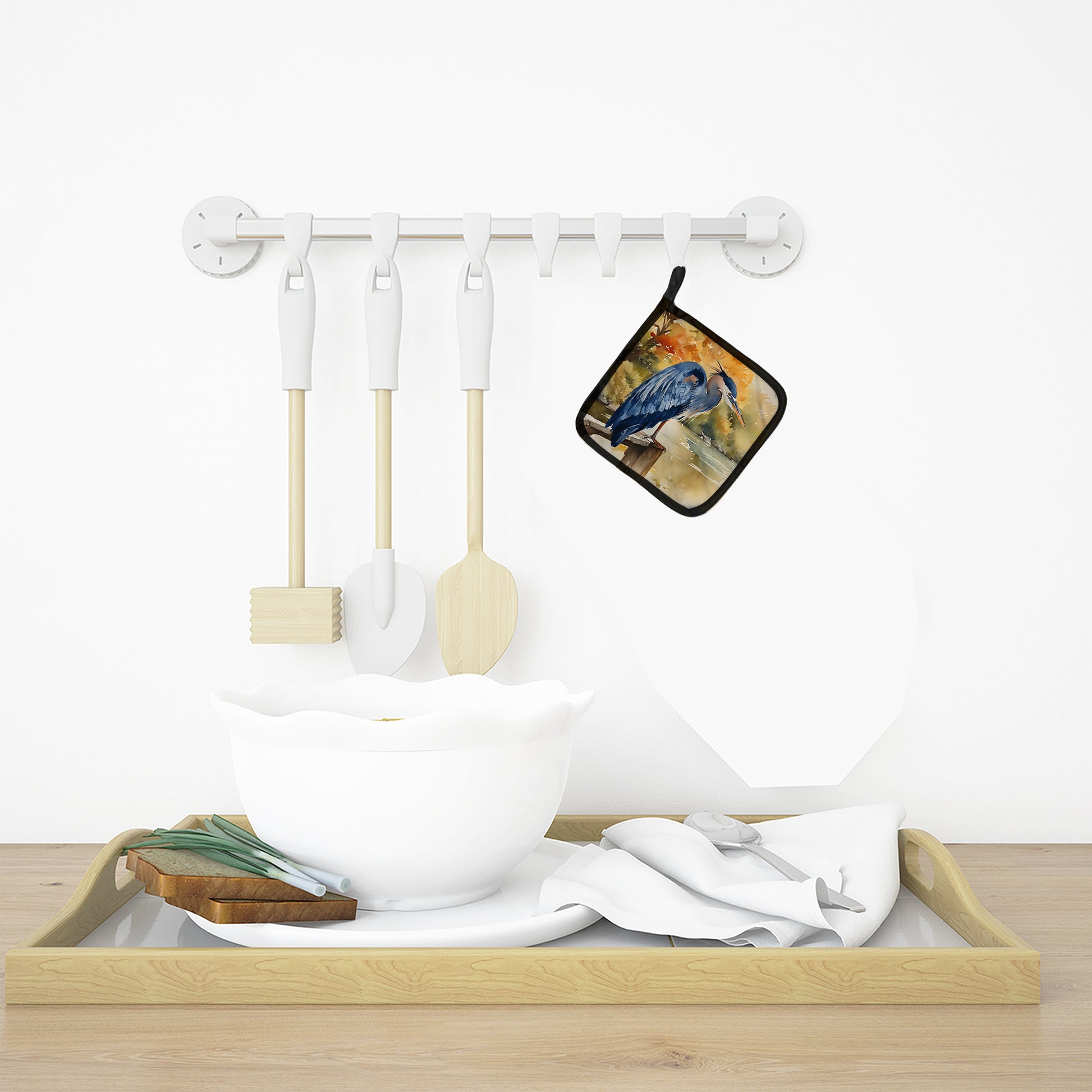 Pair of Pot Holders featuring breed specific Blue Heron artwork. A Pair of Pot Holders to match your kitchen decor. Made in the USA these are thick and functional. Full color artwork decorates the front polyester fabric of the hot pad and accented by a black trim. Use these at as a trivet for your Thanksgiving or Christmas tablescape. Filled with insulated fabric and quilted for durability. These colorful pot holders will make a great gift for your favorite home cook or executive chef. Each pot holder measures approximately 7 1/2 inches by 7 1/2 inches. A hanging tab is included.