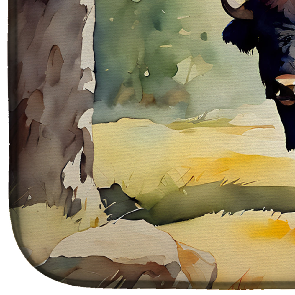 Dish Drying Mat featuring breed specific American Bison artwork. Say goodbye to messy countertops and soggy dish towels with our innovative dish drying mat. Our high-quality dish drying pad is designed to keep your countertops dry while offering a stylish and efficient solution. Whether you're air drying dishes, glasses, stemware, silverware, pots, pans, bottles, or even fruits and vegetables, our dish mat is the perfect choice. The 14 inches x 22 inches size fits most counters and dish drying racks, and the non-slip design ensures stability. Made with water-absorbent polyester and a polyurethane foam insert, our dish drying mat is not only functional but also durable. It's machine washable and printed in the USA for long-lasting use. The beautiful artwork adds flair to your kitchen decor, making it a perfect housewarming gift or present for any occasion. Upgrade your kitchen experience with our absorbent and versatile dish drying mat.