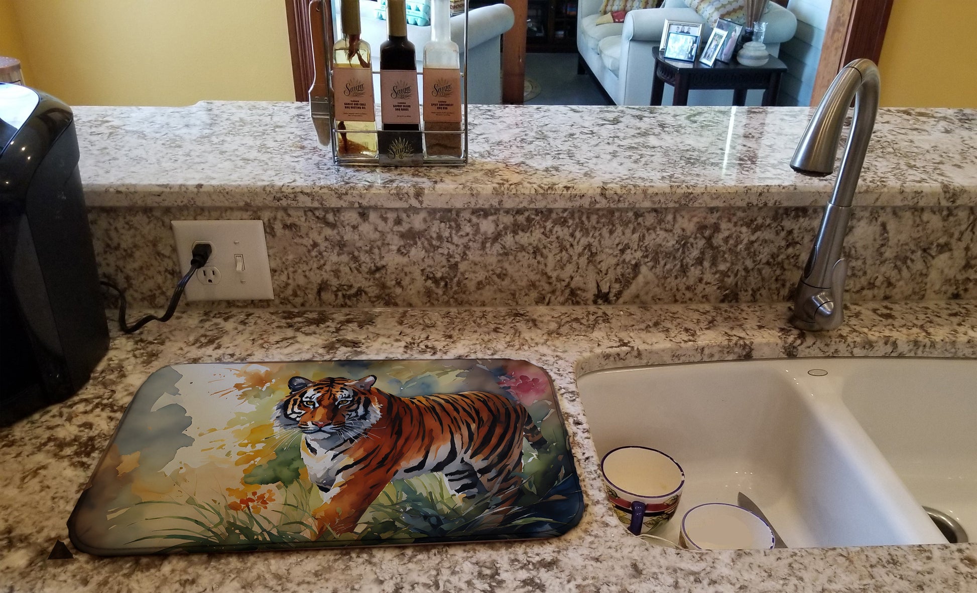 Dish Drying Mat featuring breed specific Bengal Tiger artwork. Say goodbye to messy countertops and soggy dish towels with our innovative dish drying mat. Our high-quality dish drying pad is designed to keep your countertops dry while offering a stylish and efficient solution. Whether you're air drying dishes, glasses, stemware, silverware, pots, pans, bottles, or even fruits and vegetables, our dish mat is the perfect choice. The 14 inches x 22 inches size fits most counters and dish drying racks, and the non-slip design ensures stability. Made with water-absorbent polyester and a polyurethane foam insert, our dish drying mat is not only functional but also durable. It's machine washable and printed in the USA for long-lasting use. The beautiful artwork adds flair to your kitchen decor, making it a perfect housewarming gift or present for any occasion. Upgrade your kitchen experience with our absorbent and versatile dish drying mat.