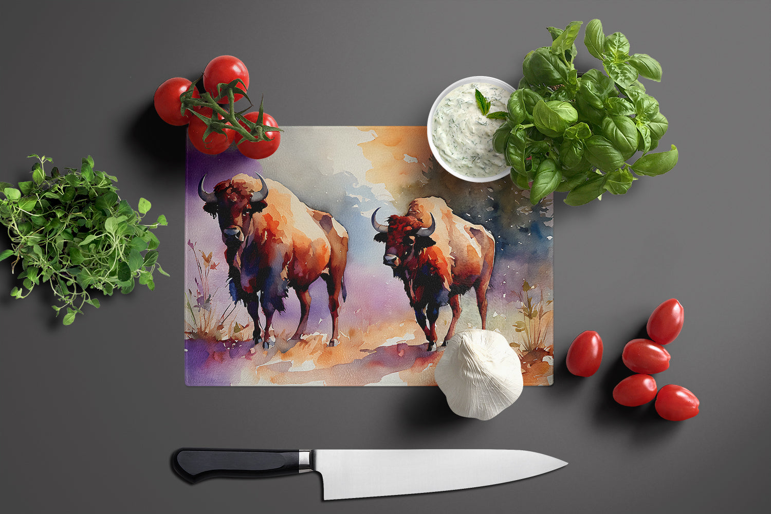 Glass Cutting Board featuring breed specific Buffalo artwork. Introduce your kitchen to the vibrant, large Decorative Glass Cutting Board from Caroline's Treasures. Crafted from resilient tempered glass, this board is not only a utilitarian necessity but also a colorful art piece. With its generous dimensions of 15 inches in height and 12 inches in length, it offers ample space for all your cutting needs. Every piece showcases captivating artwork from distinguished artists, bringing an aesthetic edge to your kitchen. Beyond its attractive design, this cutting board ensures your countertop stays pristine and unscathed, owing to its heat-resistant properties. Engineered with user convenience in mind, it features non-skid feet for stability, and rounded corners for additional safety. Its robust construction renders it virtually unbreakable, guaranteeing longevity. The board comes with protective feet bumpers, maintaining its position during use. This product is recommended to be hand washed only. Proudly printed and assembled in the United States, this cutting board exemplifies superior craftsmanship. With Caroline's Treasures' Decorative Glass Cutting Board, you're investing in a blend of functionality and artistic flair.