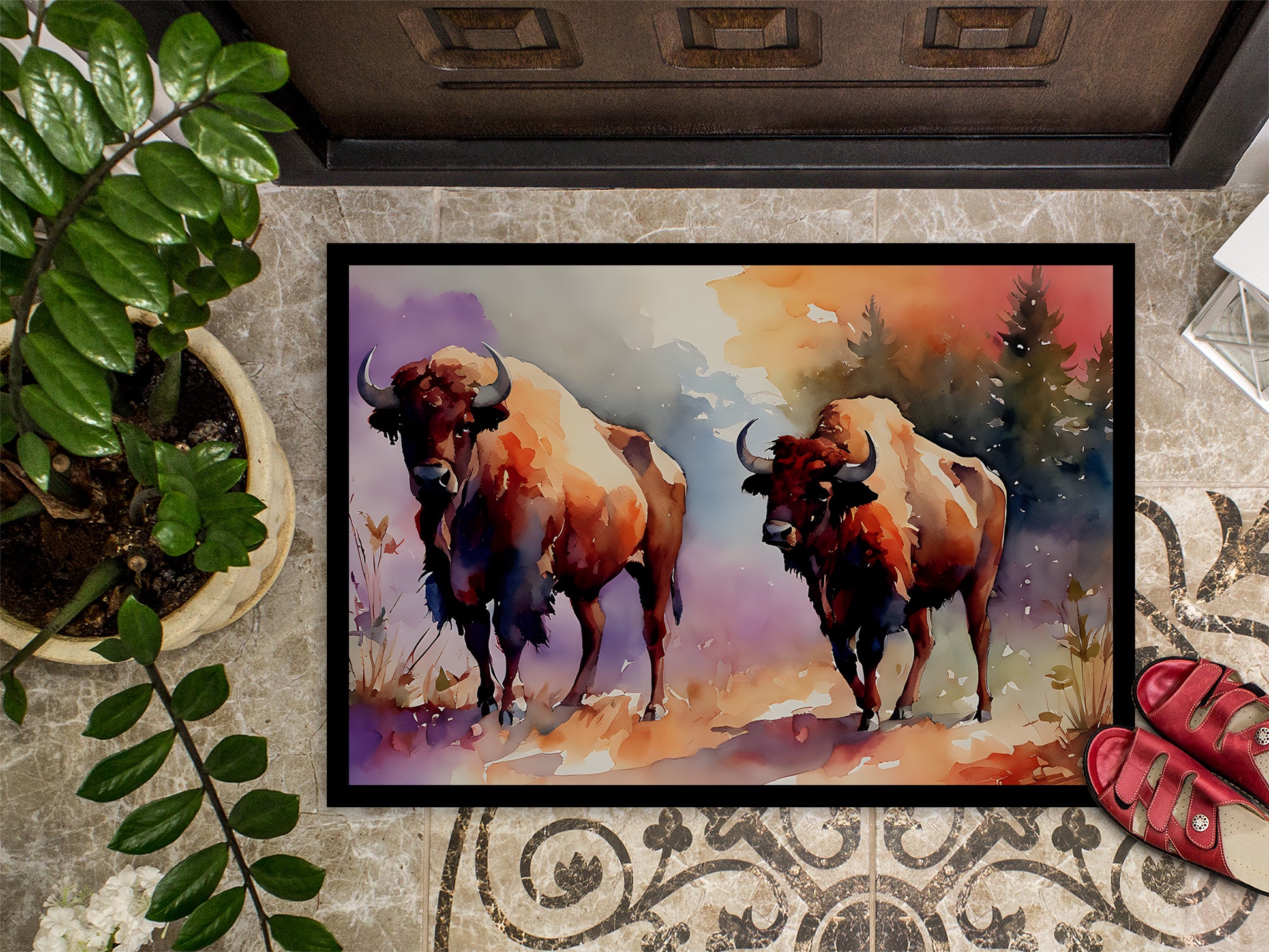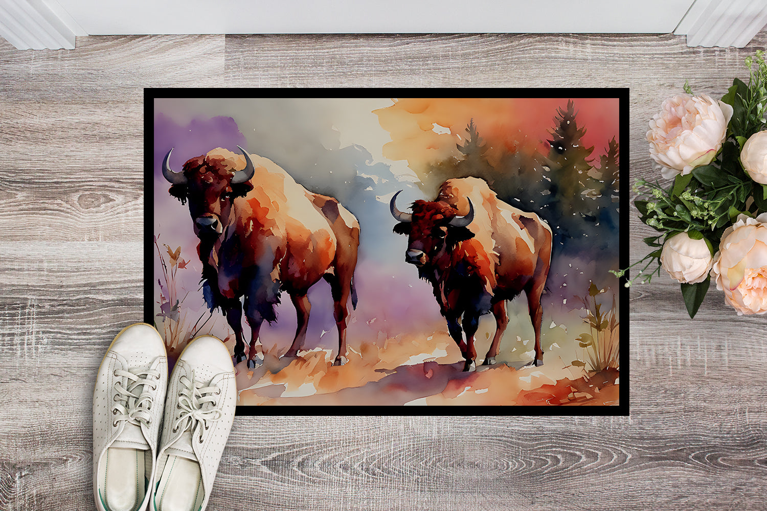 Doormat featuring breed specific Buffalo artwork. Welcome your guests in style with our Artwork Door Mat, designed to withstand almost any weather condition. This mat, measuring approximately 18 by 27 inches, is held together by durable black binding tape. Its top layer, composed of polyester felt, is dyed with the eye-catching image you see on the mat. A few layers below provide the mat with stability, while its rubber bottom is stamped to help prevent slipping and ensures safety. Our mat works wonderfully as both an indoor or outdoor door mat. For cleaning, simply hose it off with water or use a power washer - no need for any cleaner that produces suds. Avoid scrubbing with a brush, instead, opt for the vacuum on floor setting. Designed manufactured and printed in the USA, this mat is a perfect addition to your porch, outdoor kitchen, entryway, or any indoor space. Its unique design makes it a charming decorative rug that greets your guests and adds a stylish touch to your home decor.