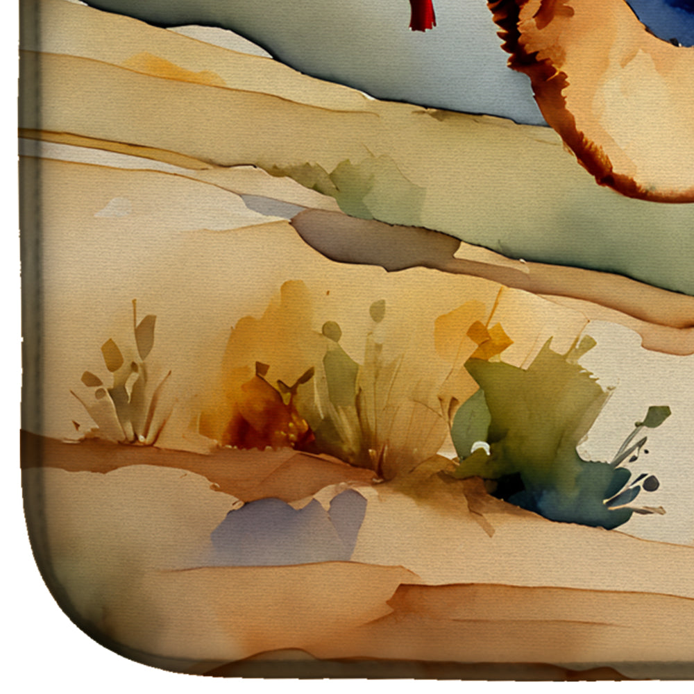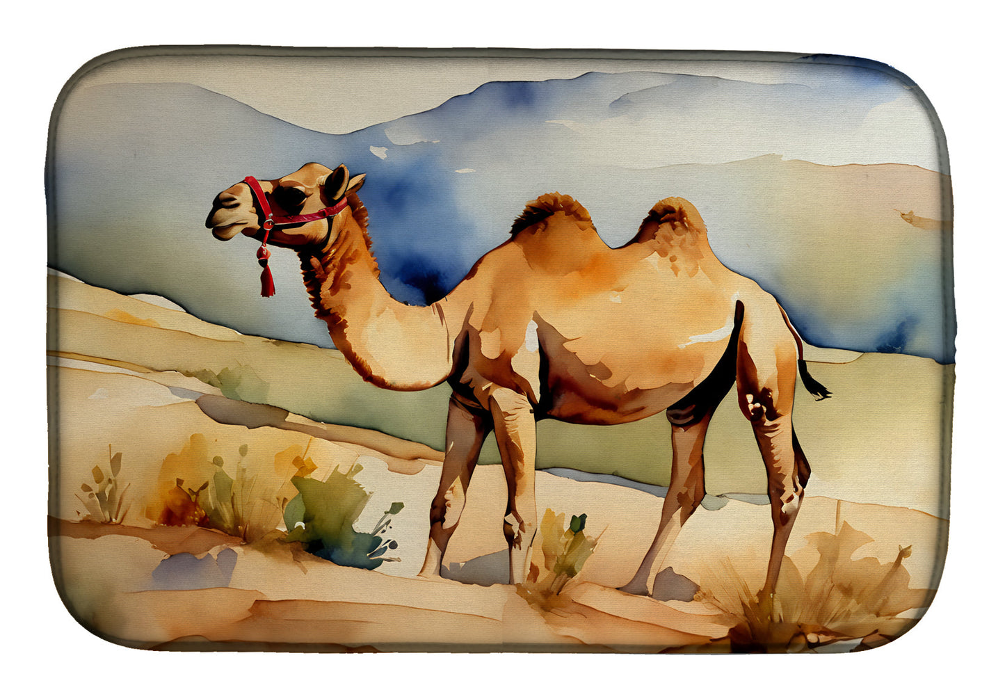 Dish Drying Mat featuring breed specific Camel artwork. Say goodbye to messy countertops and soggy dish towels with our innovative dish drying mat. Our high-quality dish drying pad is designed to keep your countertops dry while offering a stylish and efficient solution. Whether you're air drying dishes, glasses, stemware, silverware, pots, pans, bottles, or even fruits and vegetables, our dish mat is the perfect choice. The 14 inches x 22 inches size fits most counters and dish drying racks, and the non-slip design ensures stability. Made with water-absorbent polyester and a polyurethane foam insert, our dish drying mat is not only functional but also durable. It's machine washable and printed in the USA for long-lasting use. The beautiful artwork adds flair to your kitchen decor, making it a perfect housewarming gift or present for any occasion. Upgrade your kitchen experience with our absorbent and versatile dish drying mat.