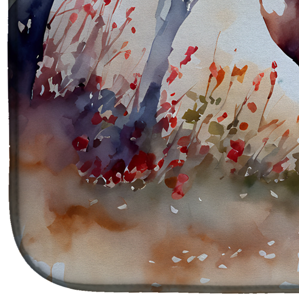 Dish Drying Mat featuring breed specific Deer artwork. Say goodbye to messy countertops and soggy dish towels with our innovative dish drying mat. Our high-quality dish drying pad is designed to keep your countertops dry while offering a stylish and efficient solution. Whether you're air drying dishes, glasses, stemware, silverware, pots, pans, bottles, or even fruits and vegetables, our dish mat is the perfect choice. The 14 inches x 22 inches size fits most counters and dish drying racks, and the non-slip design ensures stability. Made with water-absorbent polyester and a polyurethane foam insert, our dish drying mat is not only functional but also durable. It's machine washable and printed in the USA for long-lasting use. The beautiful artwork adds flair to your kitchen decor, making it a perfect housewarming gift or present for any occasion. Upgrade your kitchen experience with our absorbent and versatile dish drying mat.