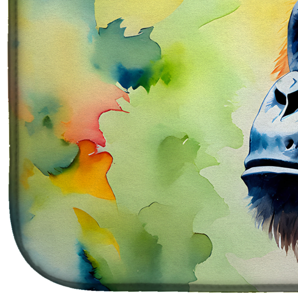 Dish Drying Mat featuring breed specific Gorilla artwork. Say goodbye to messy countertops and soggy dish towels with our innovative dish drying mat. Our high-quality dish drying pad is designed to keep your countertops dry while offering a stylish and efficient solution. Whether you're air drying dishes, glasses, stemware, silverware, pots, pans, bottles, or even fruits and vegetables, our dish mat is the perfect choice. The 14 inches x 22 inches size fits most counters and dish drying racks, and the non-slip design ensures stability. Made with water-absorbent polyester and a polyurethane foam insert, our dish drying mat is not only functional but also durable. It's machine washable and printed in the USA for long-lasting use. The beautiful artwork adds flair to your kitchen decor, making it a perfect housewarming gift or present for any occasion. Upgrade your kitchen experience with our absorbent and versatile dish drying mat.