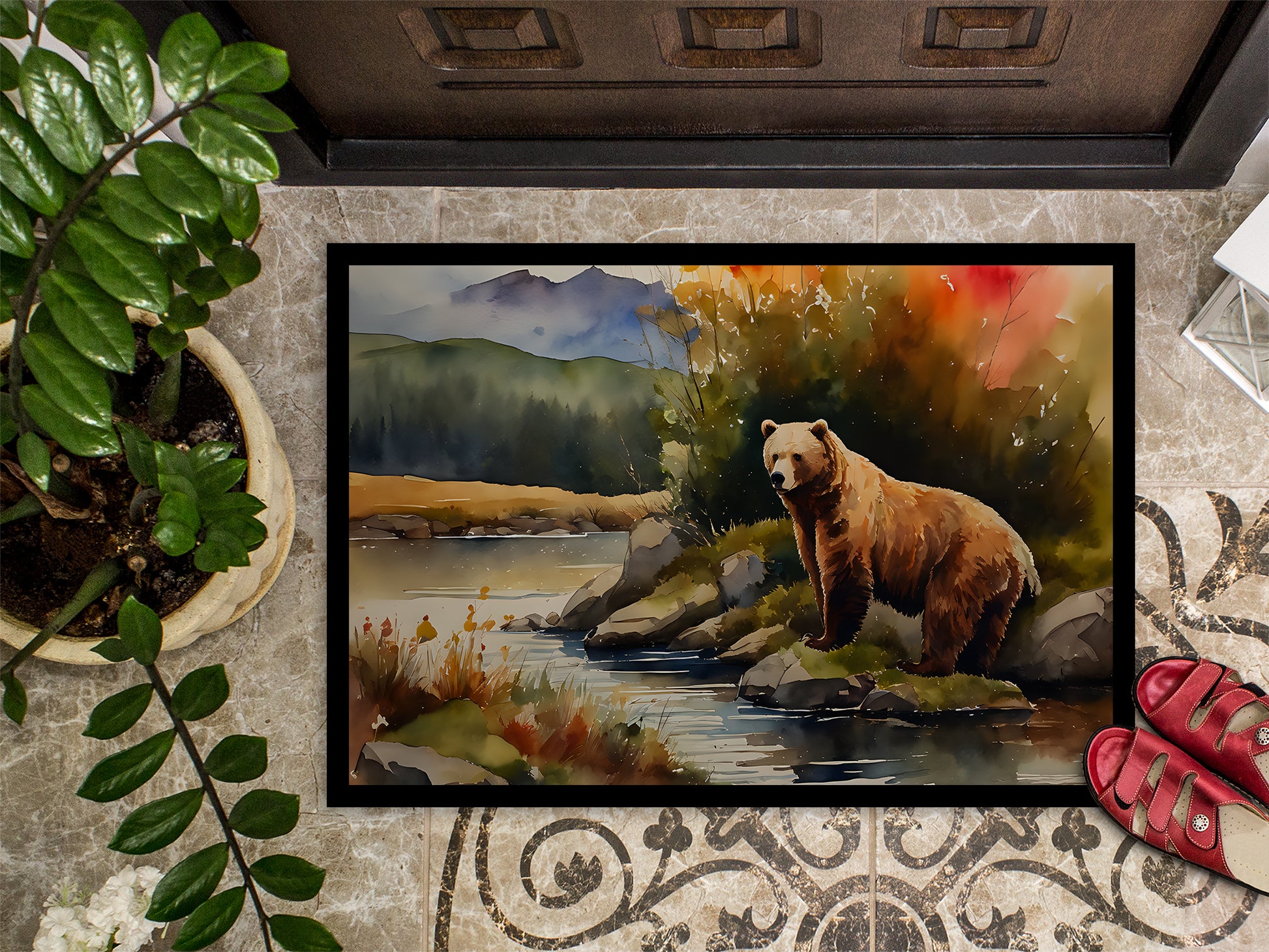 Doormat featuring breed specific Kodiak Bear artwork. Welcome your guests in style with our Artwork Door Mat, designed to withstand almost any weather condition. This mat, measuring approximately 24 by 36 inches, is held together by durable black binding tape. Its top layer, composed of polyester felt, is dyed with the eye-catching image you see on the mat. A few layers below provide the mat with stability, while its rubber bottom is stamped to help prevent slipping and ensures safety. Our mat works wonderfully as both an indoor or outdoor door mat. For cleaning, simply hose it off with water or use a power washer - no need for any cleaner that produces suds. Avoid scrubbing with a brush, instead, opt for the vacuum on floor setting. Designed manufactured and printed in the USA, this mat is a perfect addition to your porch, outdoor kitchen, entryway, or any indoor space. Its unique design makes it a charming decorative rug that greets your guests and adds a stylish touch to your home decor.