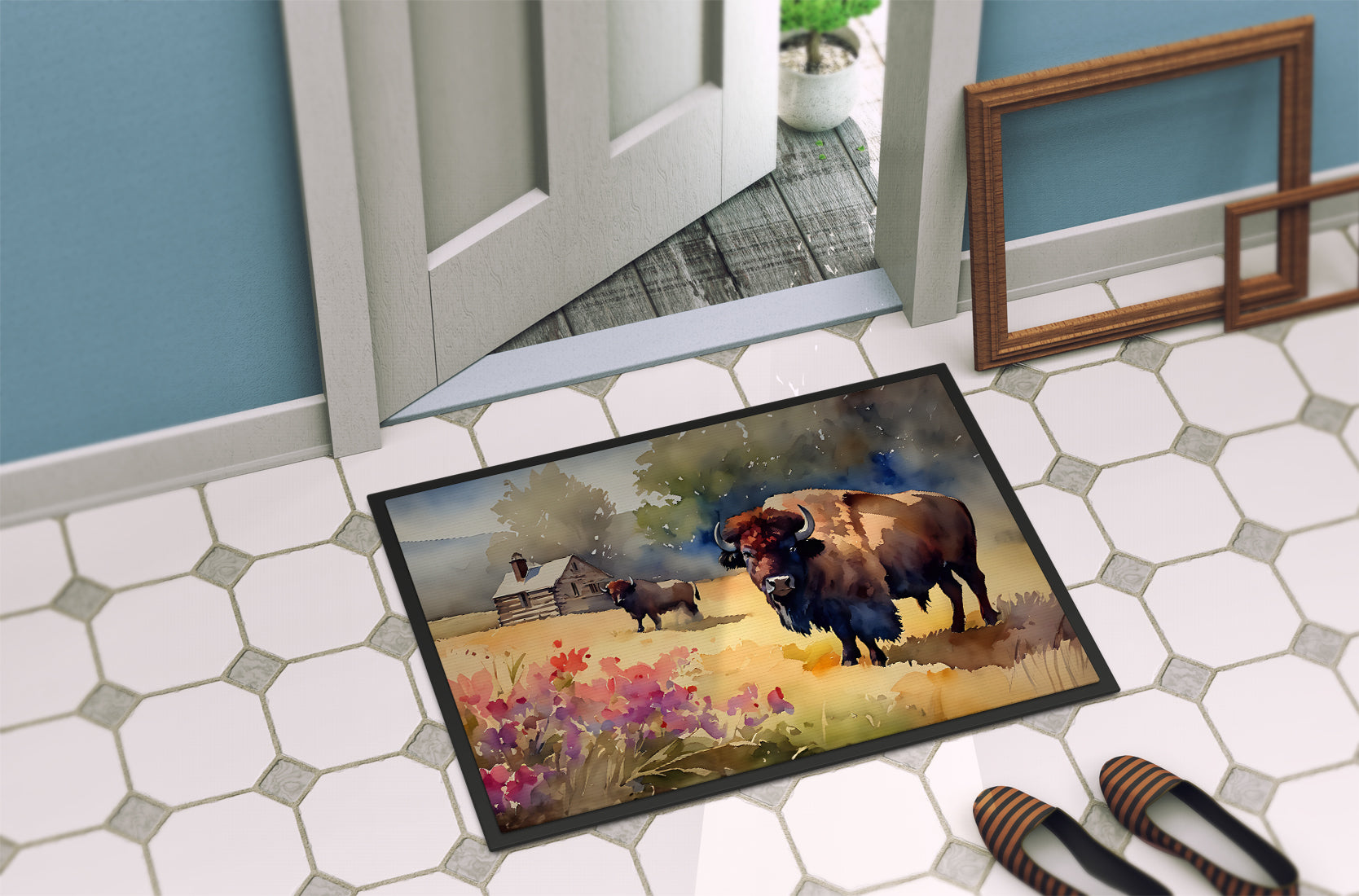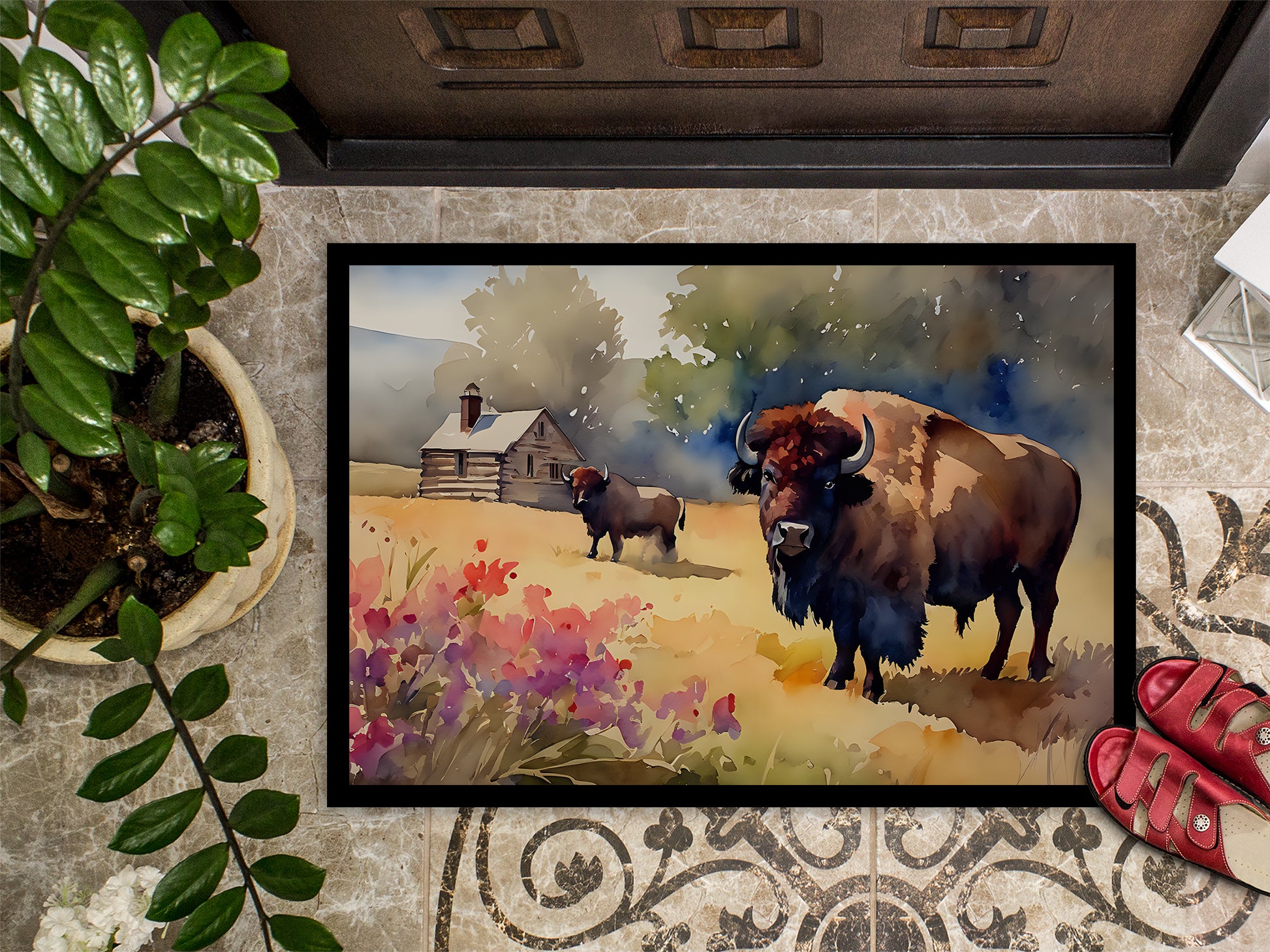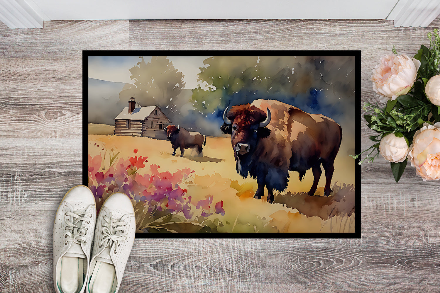 Doormat featuring breed specific Wood Bison artwork. Welcome your guests in style with our Artwork Door Mat, designed to withstand almost any weather condition. This mat, measuring approximately 24 by 36 inches, is held together by durable black binding tape. Its top layer, composed of polyester felt, is dyed with the eye-catching image you see on the mat. A few layers below provide the mat with stability, while its rubber bottom is stamped to help prevent slipping and ensures safety. Our mat works wonderfully as both an indoor or outdoor door mat. For cleaning, simply hose it off with water or use a power washer - no need for any cleaner that produces suds. Avoid scrubbing with a brush, instead, opt for the vacuum on floor setting. Designed manufactured and printed in the USA, this mat is a perfect addition to your porch, outdoor kitchen, entryway, or any indoor space. Its unique design makes it a charming decorative rug that greets your guests and adds a stylish touch to your home decor.