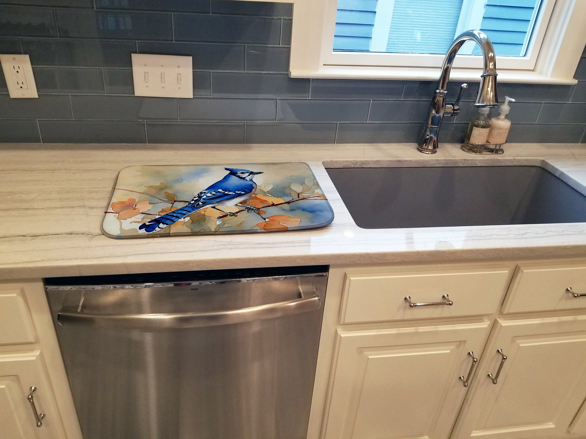 Dish Drying Mat featuring breed specific Blue Jay artwork. Say goodbye to messy countertops and soggy dish towels with our innovative dish drying mat. Our high-quality dish drying pad is designed to keep your countertops dry while offering a stylish and efficient solution. Whether you're air drying dishes, glasses, stemware, silverware, pots, pans, bottles, or even fruits and vegetables, our dish mat is the perfect choice. The 14 inches x 22 inches size fits most counters and dish drying racks, and the non-slip design ensures stability. Made with water-absorbent polyester and a polyurethane foam insert, our dish drying mat is not only functional but also durable. It's machine washable and printed in the USA for long-lasting use. The beautiful artwork adds flair to your kitchen decor, making it a perfect housewarming gift or present for any occasion. Upgrade your kitchen experience with our absorbent and versatile dish drying mat.