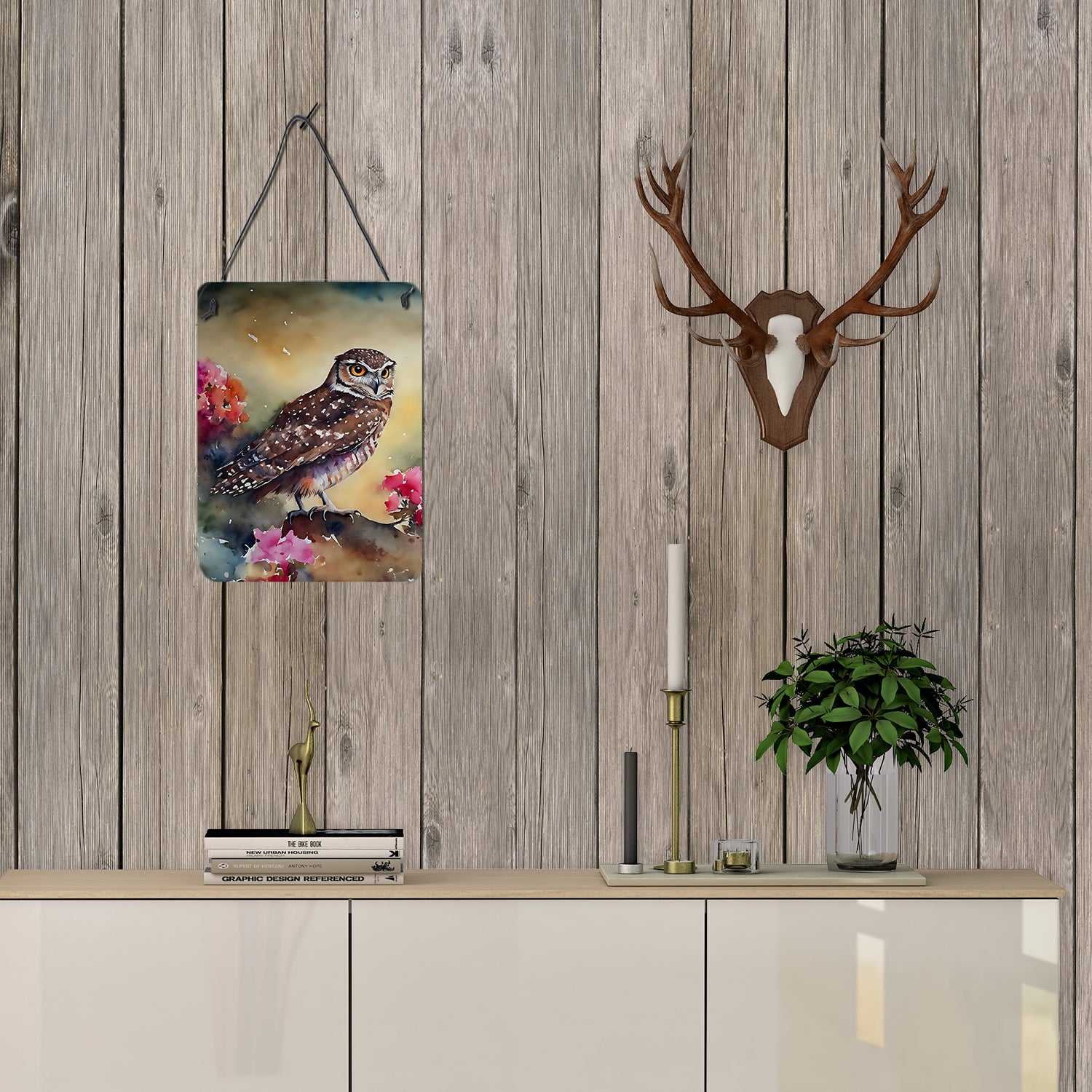 Wall or Door Hanging Prints featuring breed specific Burrowing Owl artwork. Spruce up your space with our Indoor or Outdoor Aluminum Artwork Prints. Designed to brighten your kitchen, bathroom, office, or outdoor areas like patios and porches, these prints offer a unique way to decorate your home or workspace. Measuring 12 by 16 inches, the prints are vibrant, full color, and bring an element of artistry to any setting. What makes these prints special is their durability and resistance to the elements. If placed outside, they can withstand direct sunlight for a considerable time before showing signs of fading. Crafted from rust and fade-resistant aluminum, these prints are built to last and maintain their vibrant colors. Each print comes with a black hanging rope and rounded corners for safety. The back of the print showcases a brushed silver color, adding a touch of sophistication. The lightweight design allows easy hanging with virtually any nail or screw, making installation a breeze. Whether indoors or outdoors, these prints add a distinctive touch to any space.