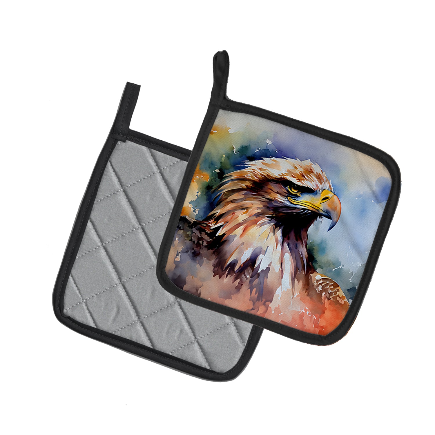 Pair of Pot Holders featuring breed specific Eagle artwork. A Pair of Pot Holders to match your kitchen decor. Made in the USA these are thick and functional. Full color artwork decorates the front polyester fabric of the hot pad and accented by a black trim. Use these at as a trivet for your Thanksgiving or Christmas tablescape. Filled with insulated fabric and quilted for durability. These colorful pot holders will make a great gift for your favorite home cook or executive chef. Each pot holder measures approximately 7 1/2 inches by 7 1/2 inches. A hanging tab is included.