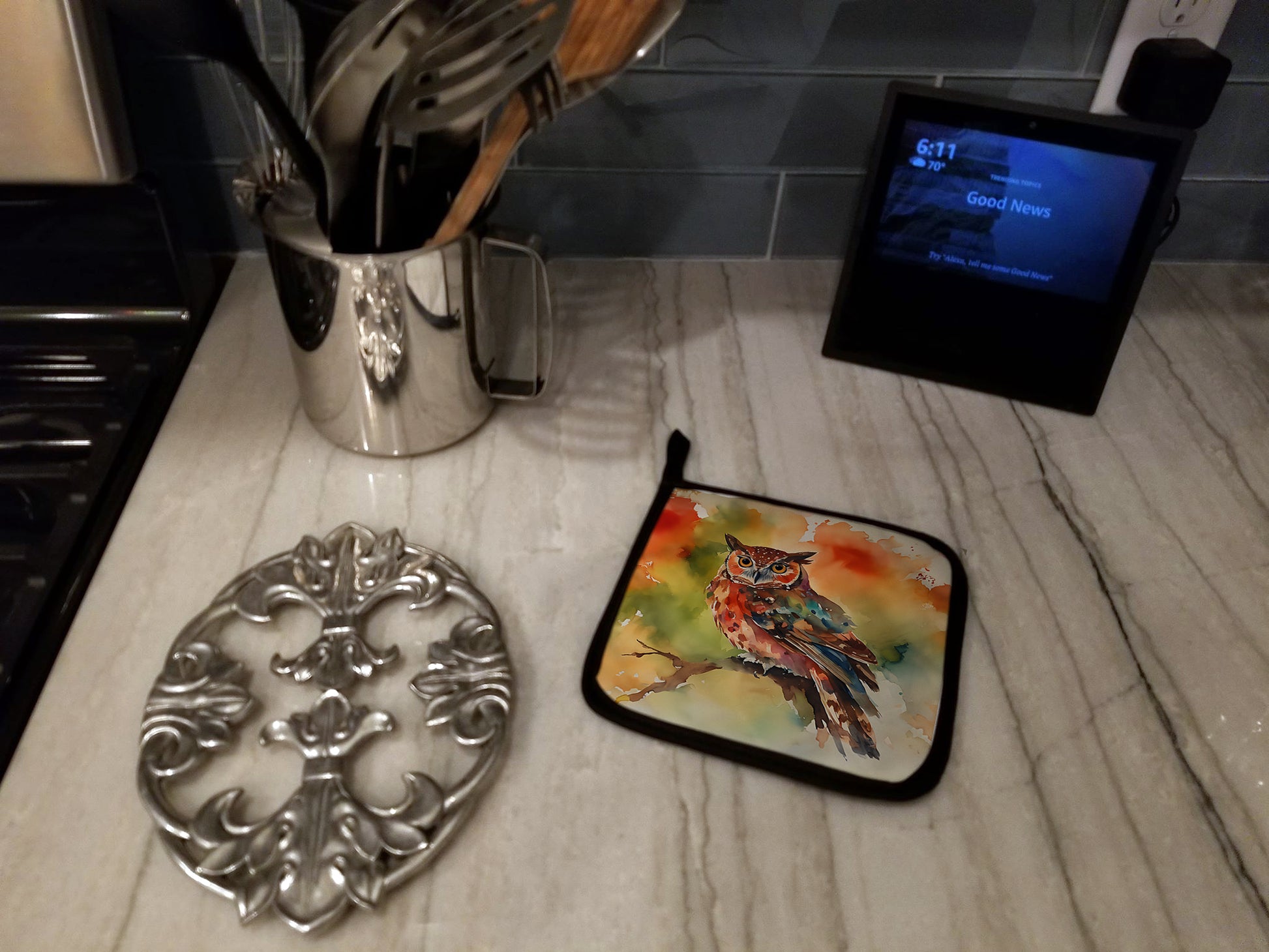 Pair of Pot Holders featuring breed specific Elf Owl artwork. A Pair of Pot Holders to match your kitchen decor. Made in the USA these are thick and functional. Full color artwork decorates the front polyester fabric of the hot pad and accented by a black trim. Use these at as a trivet for your Thanksgiving or Christmas tablescape. Filled with insulated fabric and quilted for durability. These colorful pot holders will make a great gift for your favorite home cook or executive chef. Each pot holder measures approximately 7 1/2 inches by 7 1/2 inches. A hanging tab is included.