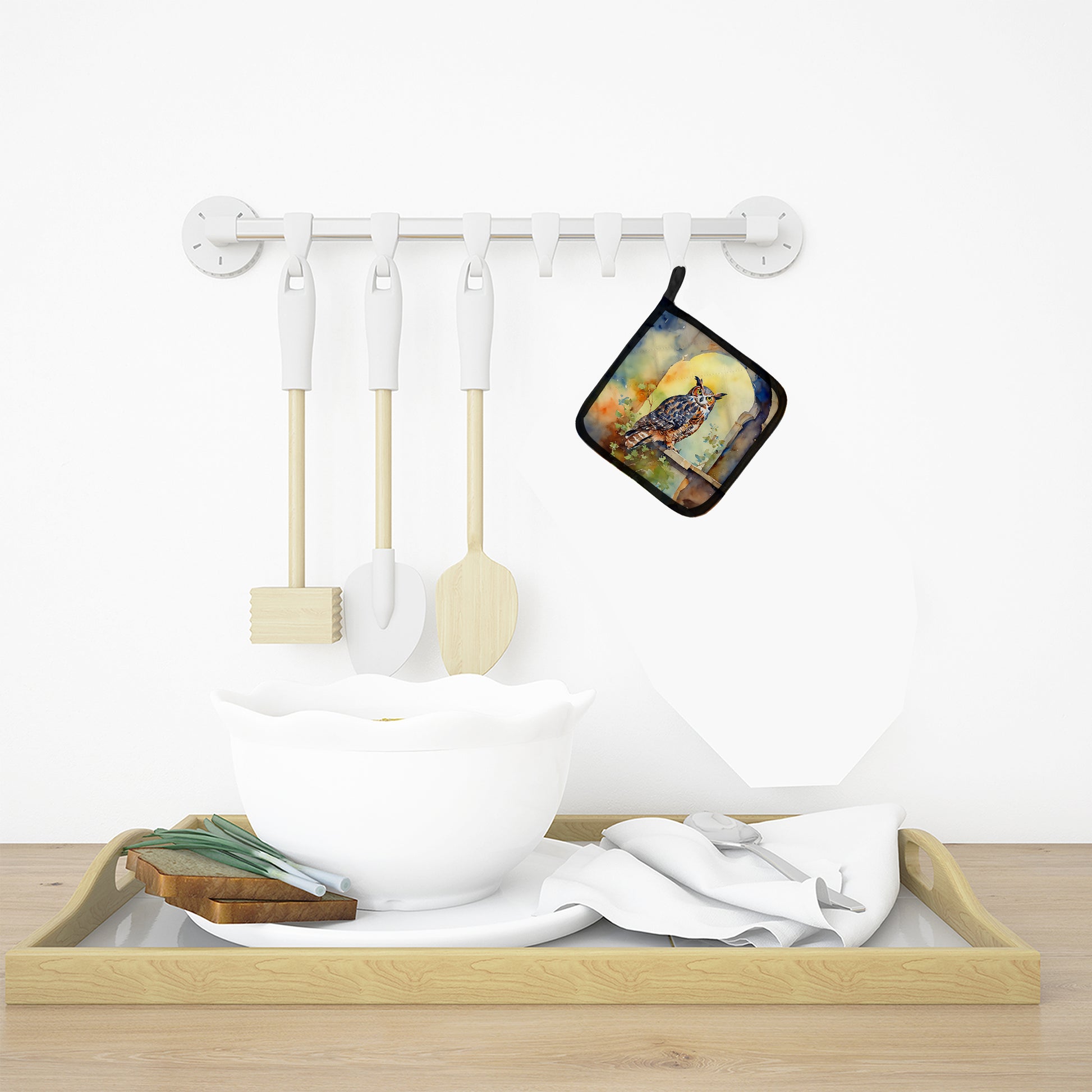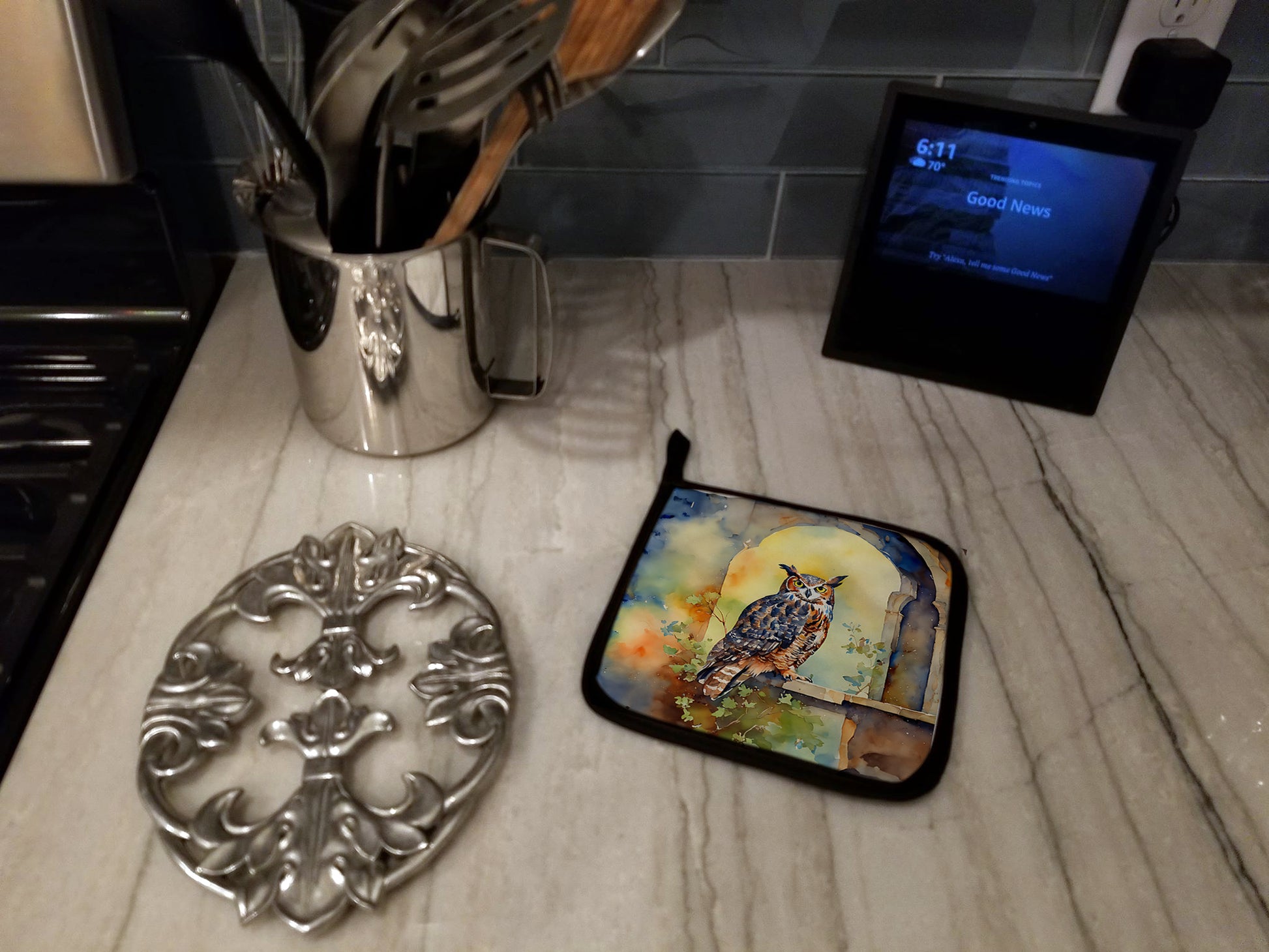 Pair of Pot Holders featuring breed specific Great Horned Owl artwork. A Pair of Pot Holders to match your kitchen decor. Made in the USA these are thick and functional. Full color artwork decorates the front polyester fabric of the hot pad and accented by a black trim. Use these at as a trivet for your Thanksgiving or Christmas tablescape. Filled with insulated fabric and quilted for durability. These colorful pot holders will make a great gift for your favorite home cook or executive chef. Each pot holder measures approximately 7 1/2 inches by 7 1/2 inches. A hanging tab is included.