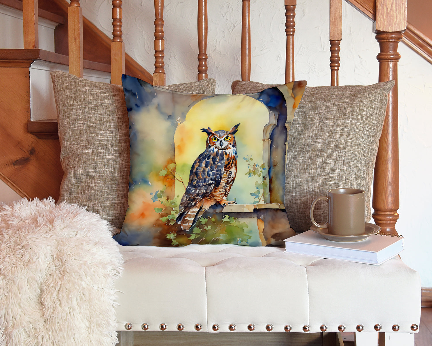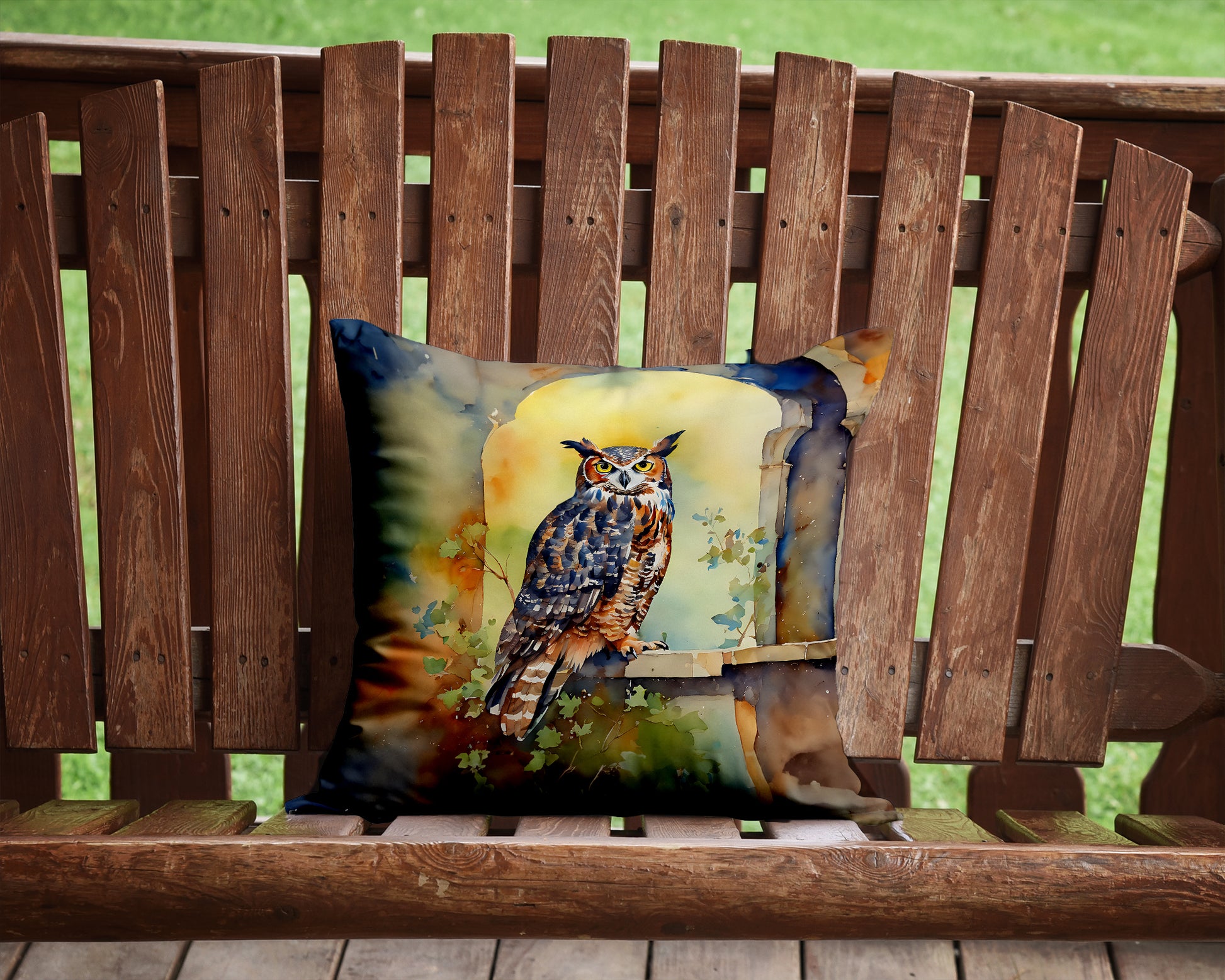 Throw Pillow featuring breed specific Great Horned Owl artwork. Add a touch of vibrancy and comfort to your outdoor seating with Caroline's Treasures Fabric Decorative Pillow. Measuring approximately 14 inches by 14 inches, this outdoor pillow is crafted to elevate the appeal of your patio furniture, infusing it with vivid color and artistic flair. The pillow includes a 100% Polyester Fabric sham filled with a quality pillow form to provide superior comfort. Innovatively made from our brand new material, specifically woven for its water resistance, this pillow is designed for durability. The soft canvas fabric offers versatility in use, fit for your indoor couch or your outdoor patio, porch, or veranda. The fabric is dyed with colorfast dyes built for resilience against weather conditions, ensuring the pillow retains its beauty over time. Constructed by sewing three fabric pieces to create a sham, the polyester insert is then nestled inside to form the pillow, resulting in an overstuffed pillow that maintains its shape. Both the sham and the pillow insert are proudly made in the United States. As the pillows are handcrafted, there may be minor variations in size, further enhancing their unique charm. Experience comfort in style with Caroline's Treasures Fabric Decorative Pillow.