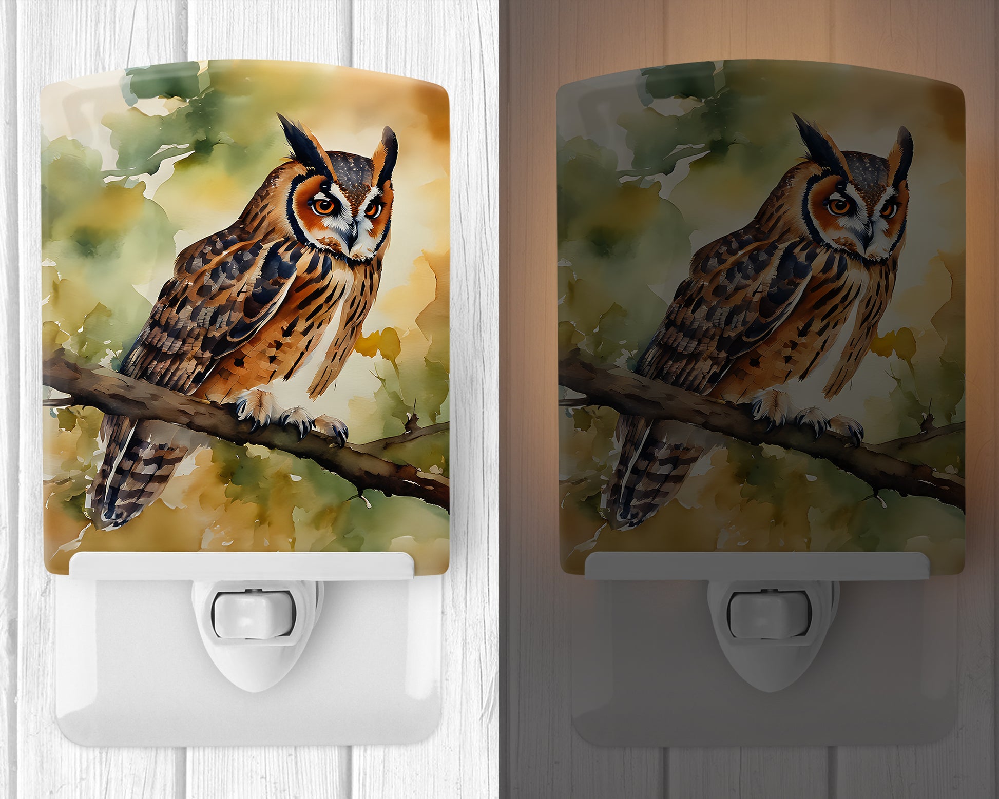Ceramic Night Light featuring breed specific Long-Eared Owl artwork. Introduce a splash of artistic flair and subtle illumination to your space with the Decorative Ceramic Night Light from Caroline's Treasures. Perfect for any room, this night light seamlessly blends functionality with an aesthetic appeal, offering a stylish solution to brighten up dark corners of your home or office. Boasting a six-inch high by four-inch wide ceramic tile at the front, it showcases vivid, full-color artwork from distinguished artists, transforming a simple utility into a vibrant art piece. The artwork is securely encased in a robust metal holder, ensuring durability and longevity. Two screws are provided to firmly affix the tile into the holder. The holder extends three inches deep, housing an included bulb that emits a soft, welcoming glow. This product meets all safety standards, as evidenced by its UL approval. Proudly made in the United States from imported components, this Decorative Ceramic Night Light is not just a functional device; it's a statement piece that enhances the ambiance of your surroundings.